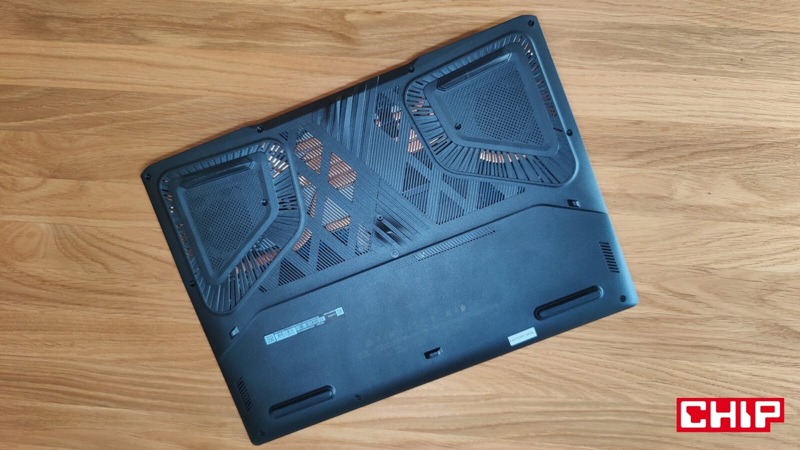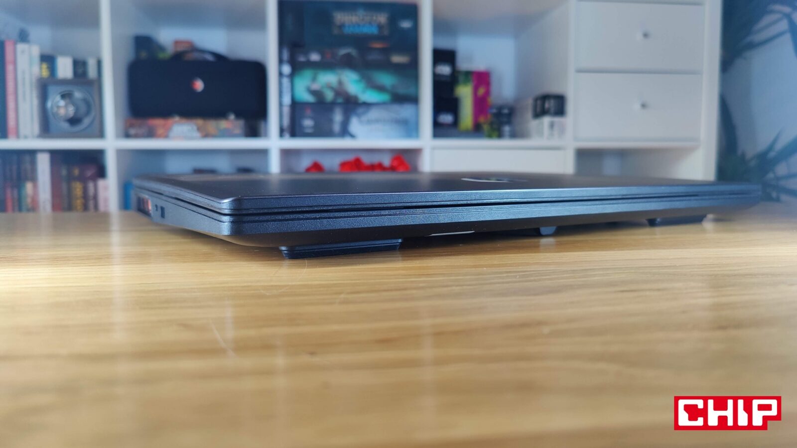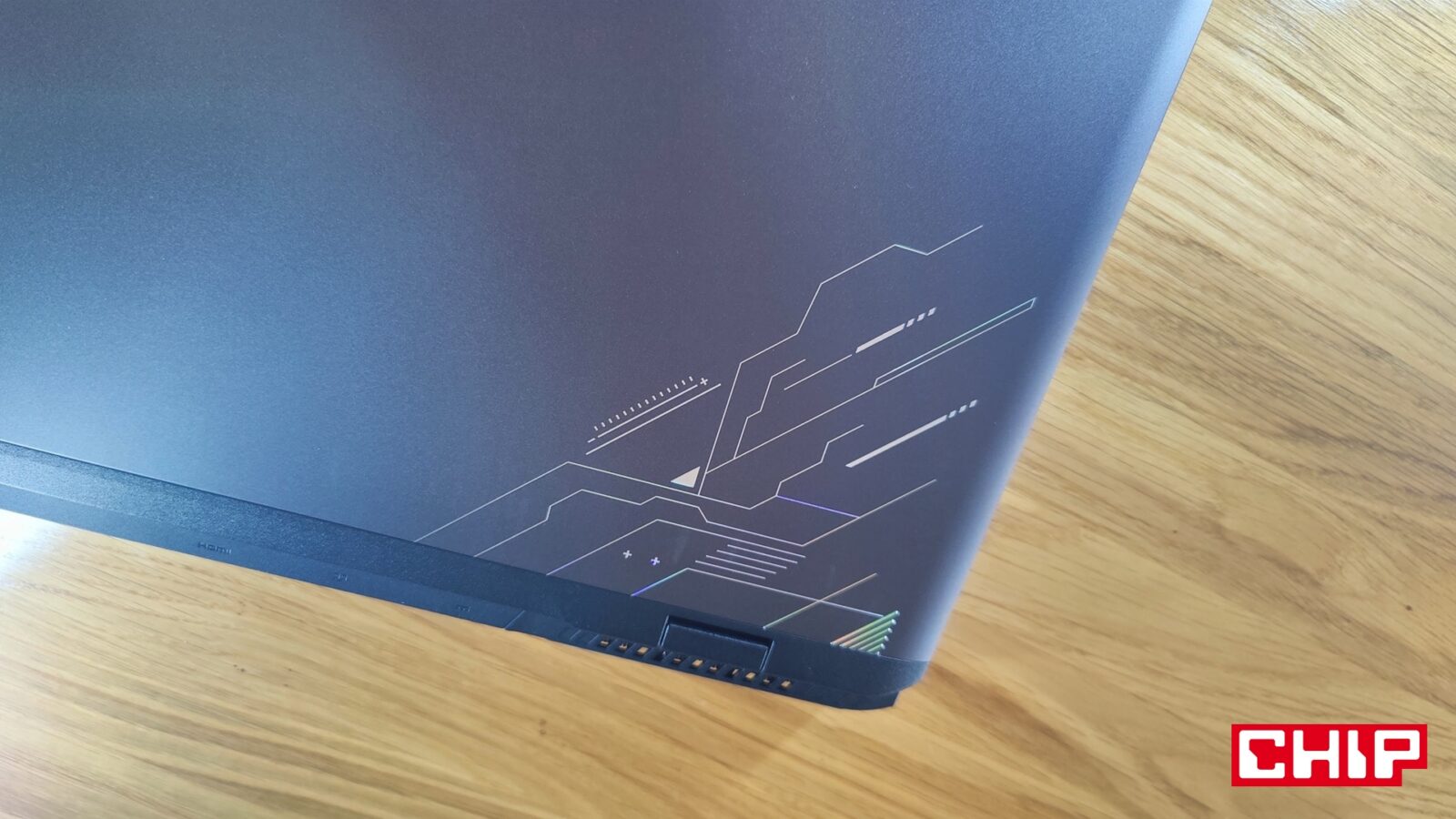 Metalowa pokrywa w kolorze Cosmos Gray jest praktyczna w codziennym użytkowaniu, trudniej na niej o “powstające znikąd” odciski palców, a metaliczne futurystyczne ozdóbki i logotyp producenta w jej centrum przykuwa od razu wzrok. Resztę obudowy buduje już z kolei twardy plastik, a ogólna stabilność sprzętu wypada świetnie, bo podnoszenie go za jeden róg po otwarciu nie wygina zanadto konstrukcji i (co najważniejsze) nie doprowadza do niepokojącego skrzypienia czy zawieszania się systemu. Nawet stosunkowo lekkie naciskanie w środkowej części dolnego panelu powoduje jednak wyginanie się obudowy, ale na co dzień nie jest to w ogóle odczuwalne.