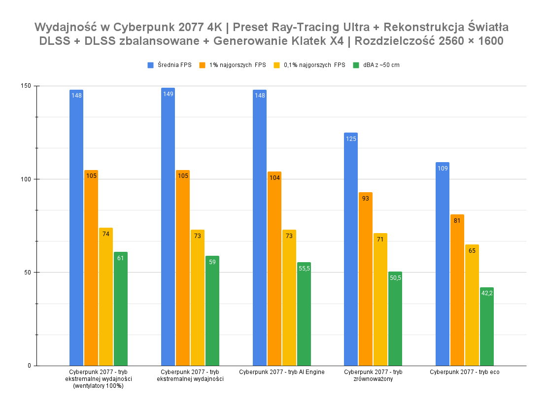 W tym teście (subiektywnie) najgorszej wypadł MSI AI Engine i to przede wszystkim dlatego, że dosłownie szalał z wentylatorami, zarządzając ich prędkością w bardzo chaotyczny sposób. Nie tylko podczas grania, ale nawet przy ot, włączeniu laptopa. Jego możliwości w zakresie wydajności są jednak zbliżone do trybu ekstremalnej wydajności i to właśnie jego powinniście wybierać, jeśli szukacie największych możliwości. Racjonalnie jest jednak zejść do poziomu zrównoważonego, bo wtedy może i tracimy 15-20% płynności, ale zyskujemy całe 5 dBA cichszy laptop, a to w przypadku braku słuchawek jest wręcz na wagę złota. Pobór energii? Inteligentne gniazdko zgłosiło maksymalnie 234 waty.