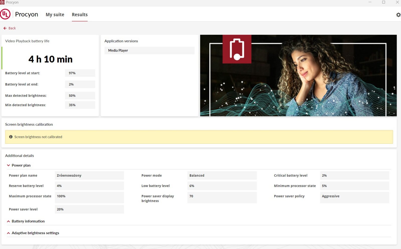 Praca biurowa? Możecie liczyć na od 4-8 godzin na jednym ładowaniu, które trwa około 90 minut do pełnego naładowania. Wszystko zależy od tego, co dokładnie robicie na laptopie i jak bardzo jasnego ekranu potrzebujecie. Test w Procyon zgłosił nieco ponad 4 godziny w trybie zrównoważonym na 50% poziomie jasności. To świetny wynik, jak na laptopa z takim ekranem.