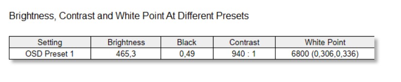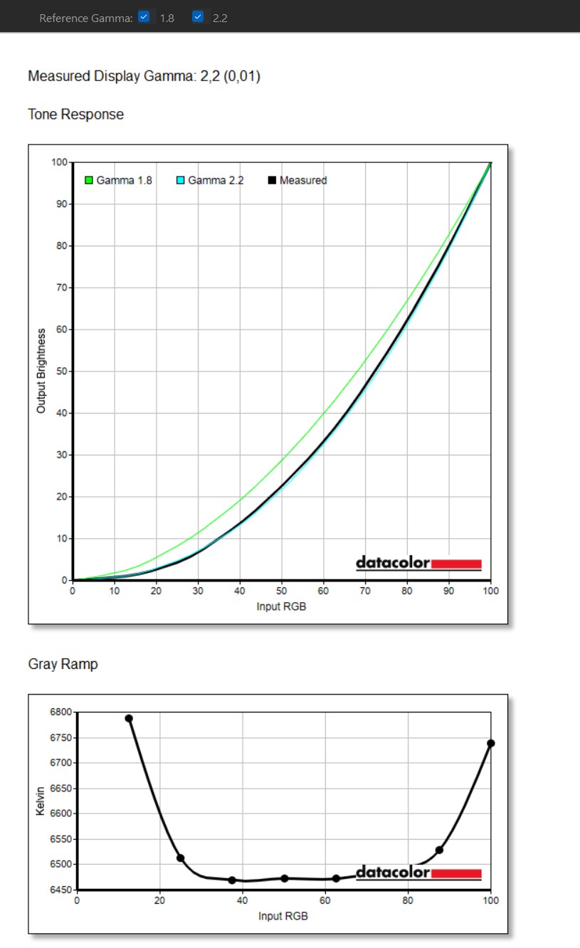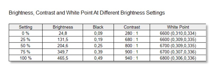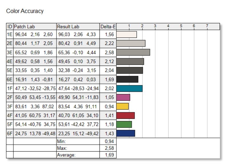 Panel wypada bardzo solidnie. Pokrywa 100% sRGB, 99% P3 i 89% AdobeRGB, a krzywa gamma trafia praktycznie w cel 2,2. Maksymalna jasność sięga z kolei 465 cd/m², przy kontraście rzędu 940:1 i lekko chłodnym punkcie bieli ok. 6700-6800 K. Średni błąd odwzorowania barw wyniósł 1,69 ΔE (min 0,94, max 2,58), więc kolory są wiarygodne i to bez dodatkowej kalibracji.