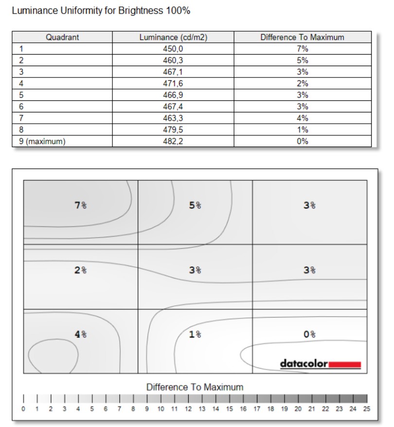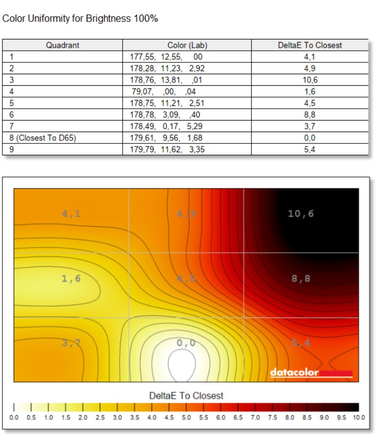 Równomierność jasności jest dobra jak na IPS, jako że odchyłki sięgają maksymalnie 7% względem najjaśniejszego obszaru. Równomierność kolorystyczna jest bardziej zróżnicowana i w prawym górnym rogu potrafi dojść do ok. 10,6 ΔE, podczas gdy centrum i dolne partie mieszczą się blisko wzorca. Sumarycznie to jasny, szybki i dobrze skalibrowany fabrycznie ekran, który nada się zarówno do pracy kreatywnej w przestrzeni P3, jak i do codziennych zastosowań.