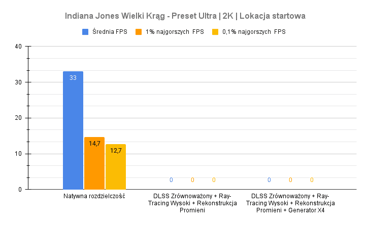 Jeśli z kolei idzie o inne gry oraz konkretne ustawienia, zacznijmy od największej bolączki MSI Crosshair 17 HX AI D2XWGKG-006XPL, a więc 8 GB pamięci VRAM, która… ogranicza. Mówi się o tym wprawdzie sporo, bo w dzisiejszych czasach nie jest to pojemność racjonalna, ale czasem trudno o przykłady. Spójrzcie jednak na wynik w Indiana Jones Wielki Krąg na presecie Ultra w 2K – gra jest wtedy kompletnie niegrywalna, a próba aktywacji DLSS doprowadza do jej crasha, bo tak się składa, że nie jest to funkcja “działająca na niczym” i trochę zasobów do działania potrzebuje. Żeby więc w taką grę w ogóle pograć, to trzeba zejść ustawieniami na poziom średni, a możemy być pewni, że z roku na rok takich oto gier będzie tylko przybywać.
