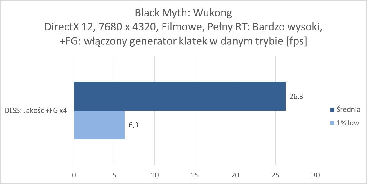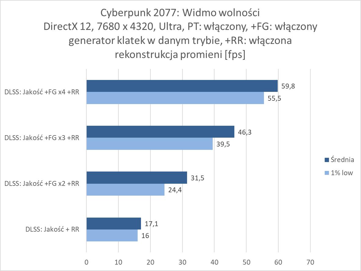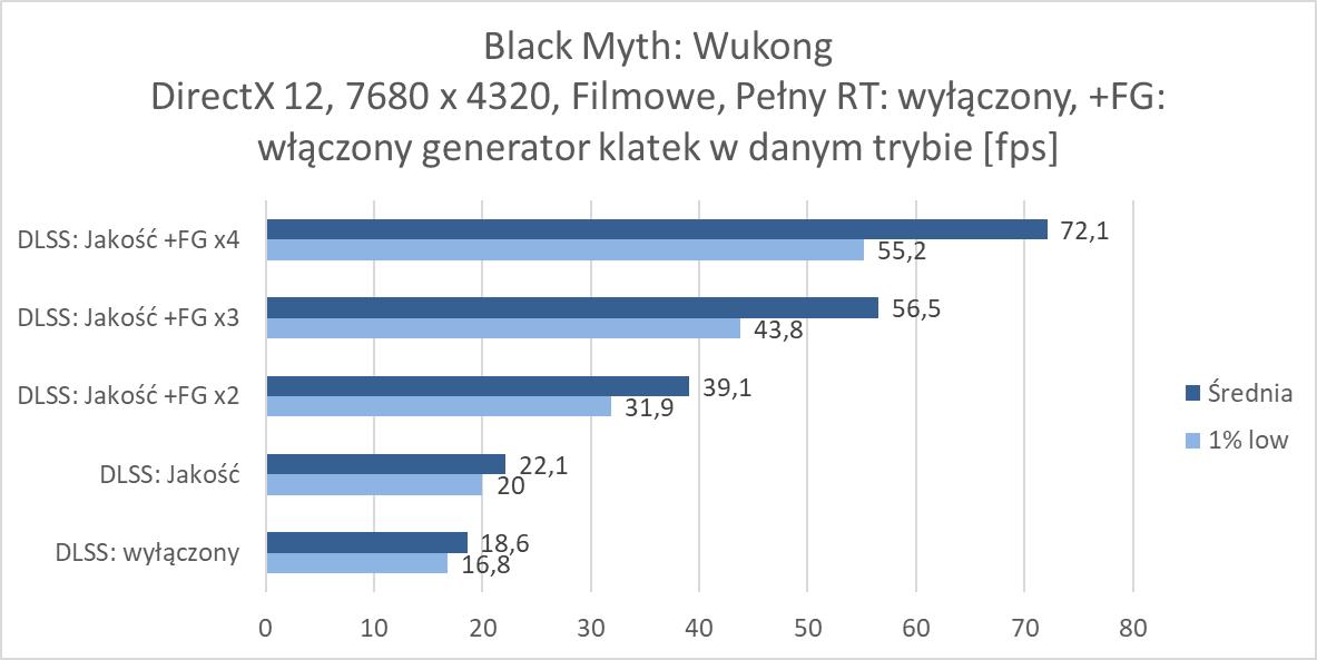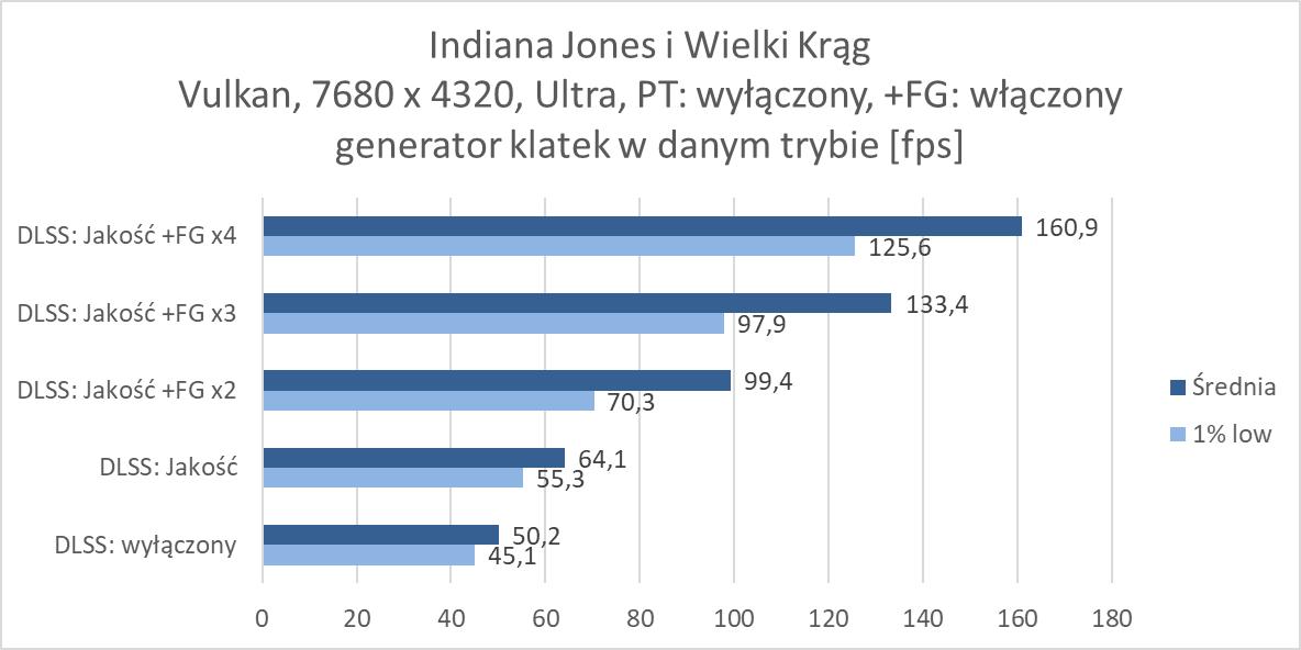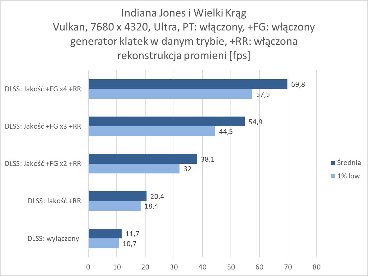 Rozgrywka w rozdzielczości 8K jest więc możliwa, ale tylko dzięki włączonemu DLSS 4. Nawet przy braku ray tracingu czy path tracingu trzeba go włączyć, bo bez tej technologii rozgrywka nie jest po prostu możliwa w większości wymagających gier. W rasteryzacji przyda się również generator klatek przynajmniej w trybie x2. Jest wyjątek w postaci Indiany Jones, gdzie nawet bez DLSS notujemy wysoki wynik, jednakże dopiero z DLSS: Jakość powyżej 60 fps, ale jest też Black Myth: Wukong, gdzie do uzyskania ponad 60 fps przyda się generator w trybie x4. W przypadku ray tracingu przyda się FG w trybie x3, a przy path tracingu x4. Przy tym ostatnim zdarzą się gry jak Black Myth: Wukong, gdzie nie ma mowy o rozgrywce nawet przy takim ustawieniu. Warto jednak docenić, że nawet przy PT dzięki generatorowi w trybie x4 możecie po prostu pograć w prawie każdy tytuł. Oczywiście generator klatek w szczególności przy wyższych ustawieniach nie jest idealny, ma swoje wady i nie każdemu musi odpowiadać rozgrywka z włączoną tą funkcją. Ale jeśli przymierzacie się do takiej rozdzielczości i chcielibyście cieszyć się z najwyższych możliwych ustawień to zbytnio innej opcji nie ma – nawet przy najwydajniejszej karcie dla graczy.