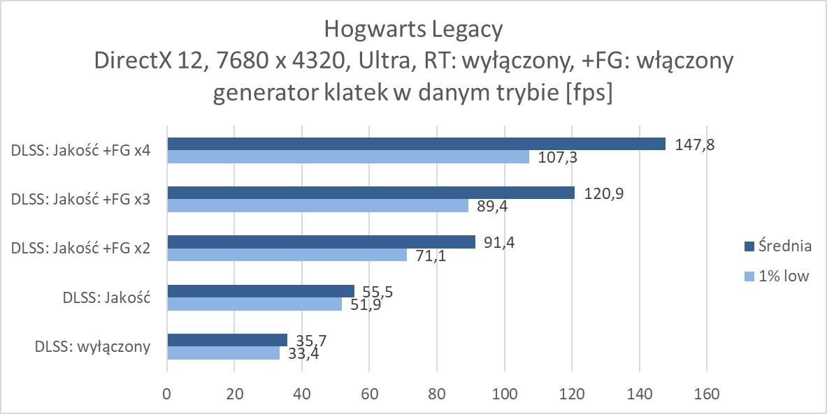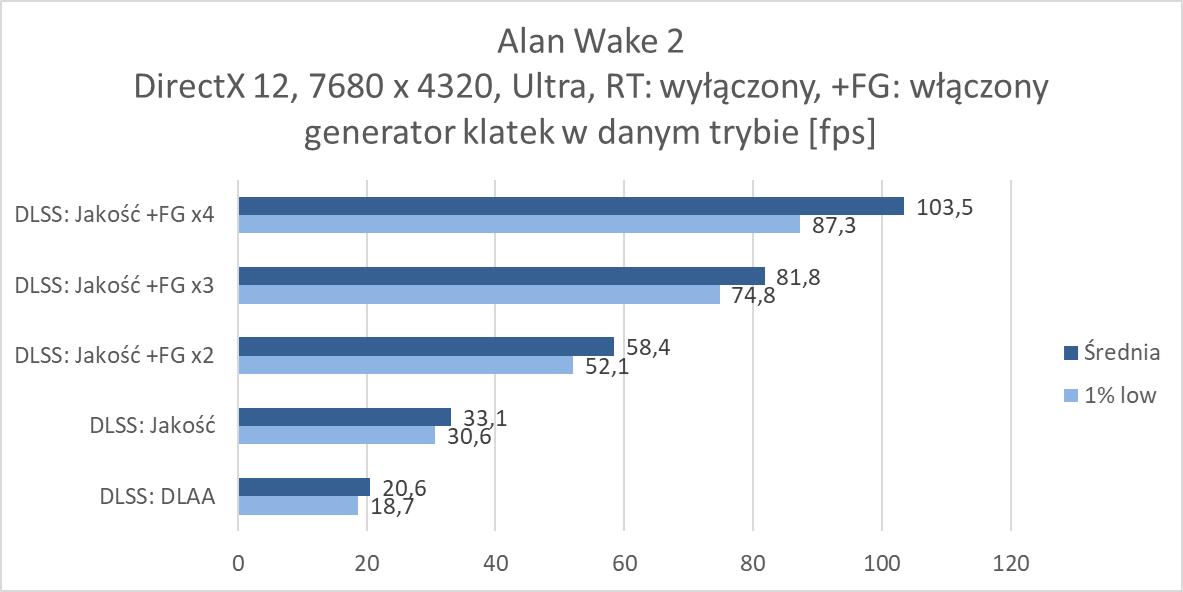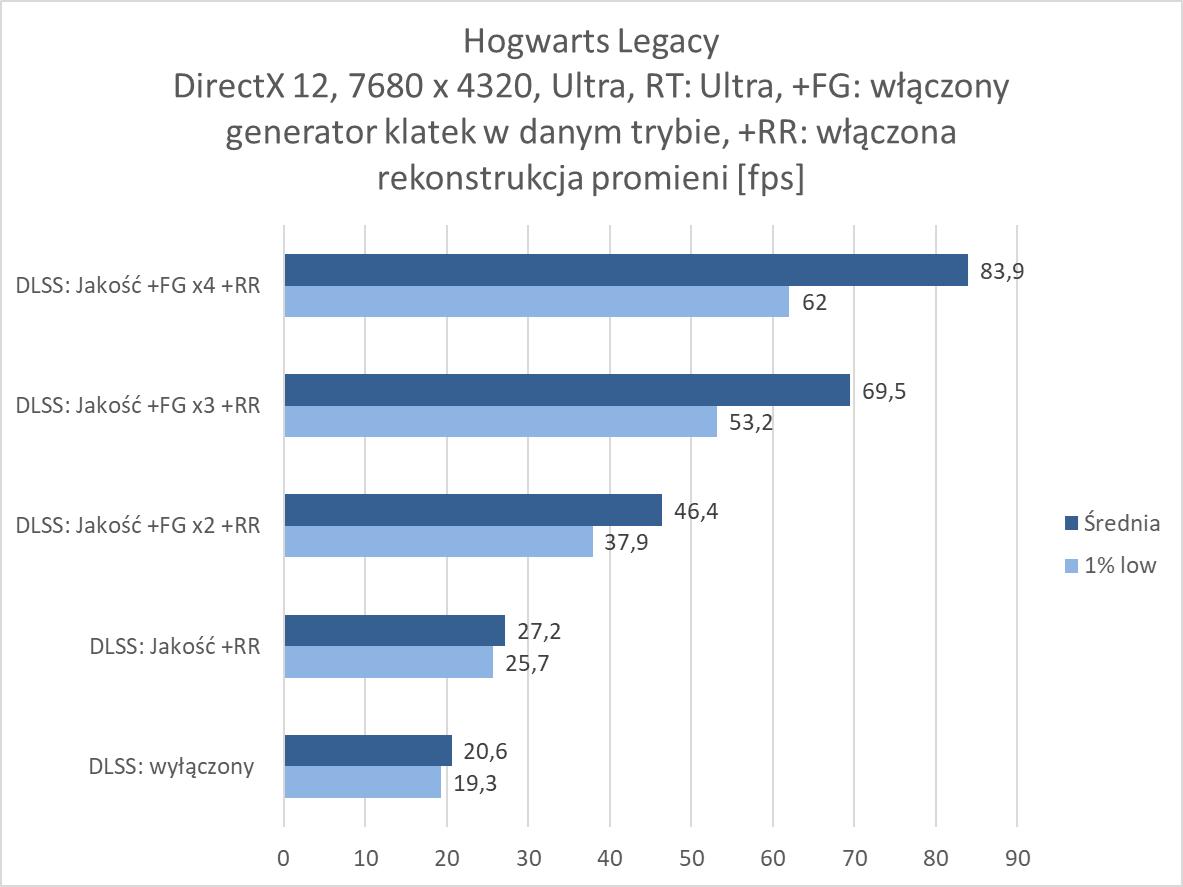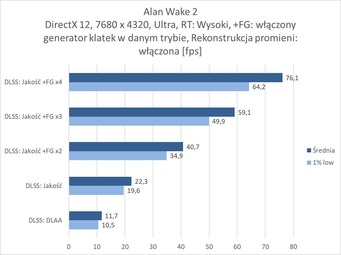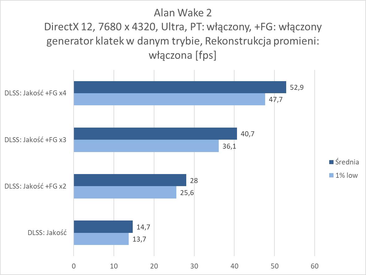Rozgrywka w rozdzielczości 8K jest więc możliwa, ale tylko dzięki włączonemu DLSS 4. Nawet przy braku ray tracingu czy path tracingu trzeba go włączyć, bo bez tej technologii rozgrywka nie jest po prostu możliwa w większości wymagających gier. W rasteryzacji przyda się również generator klatek przynajmniej w trybie x2. Jest wyjątek w postaci Indiany Jones, gdzie nawet bez DLSS notujemy wysoki wynik, jednakże dopiero z DLSS: Jakość powyżej 60 fps, ale jest też Black Myth: Wukong, gdzie do uzyskania ponad 60 fps przyda się generator w trybie x4. W przypadku ray tracingu przyda się FG w trybie x3, a przy path tracingu x4. Przy tym ostatnim zdarzą się gry jak Black Myth: Wukong, gdzie nie ma mowy o rozgrywce nawet przy takim ustawieniu. Warto jednak docenić, że nawet przy PT dzięki generatorowi w trybie x4 możecie po prostu pograć w prawie każdy tytuł. Oczywiście generator klatek w szczególności przy wyższych ustawieniach nie jest idealny, ma swoje wady i nie każdemu musi odpowiadać rozgrywka z włączoną tą funkcją. Ale jeśli przymierzacie się do takiej rozdzielczości i chcielibyście cieszyć się z najwyższych możliwych ustawień to zbytnio innej opcji nie ma – nawet przy najwydajniejszej karcie dla graczy.