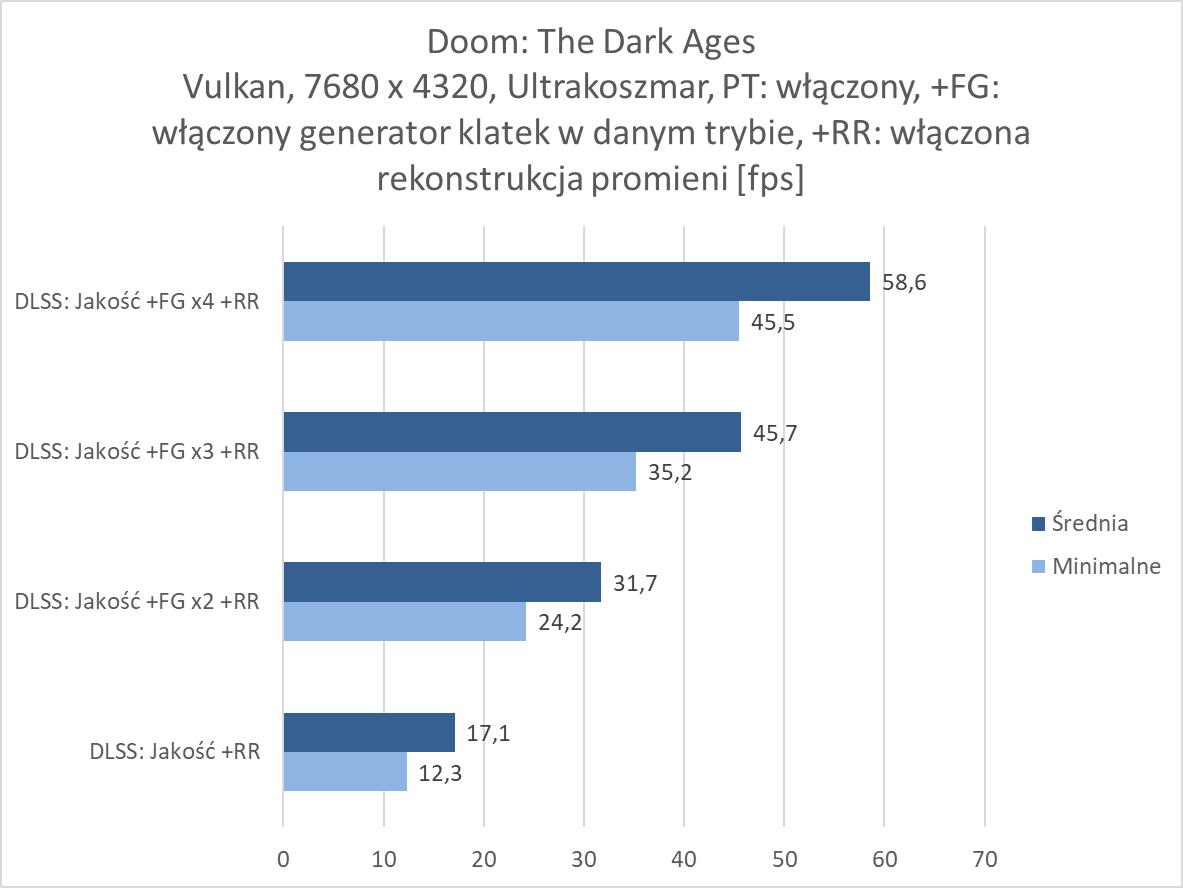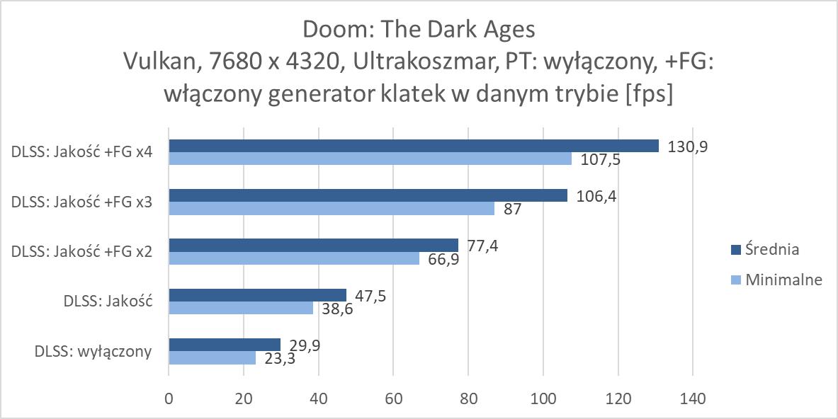 Path tracing to najbardziej wymagające ustawienia, więc generator klatek w wyższych ustawieniach okazuje się jedynym wyjściem. Bez DLSS nie udało nam się przeprowadzić testów w żadnym z tytułów. Zresztą zobaczcie sami jak bardzo niskie wyniki są nawet przy DLSS: Jakość. Generator klatek x2 również jest za słabym ustawieniem do każdej z gier. Tak naprawdę dopiero x4 możecie liczyć na dobre wyniki, choć 60 fps przebił tylko Indiana Jones. Poza nim mamy trzy gry z wynikami powyżej 50 fps (ale Cyberpunk 2077 notuje praktycznie 60 fps, Doom tylko minimalnie poniżej). W przypadku Black Myth: Wukong nie można mówić o jakiejkolwiek rozgrywce nawet przy FG x4 – tutaj jedynie przy tych ustawieniach udało nam się wykonać testy, a wyniki i tak nie pozwalają cieszyć się z gry.