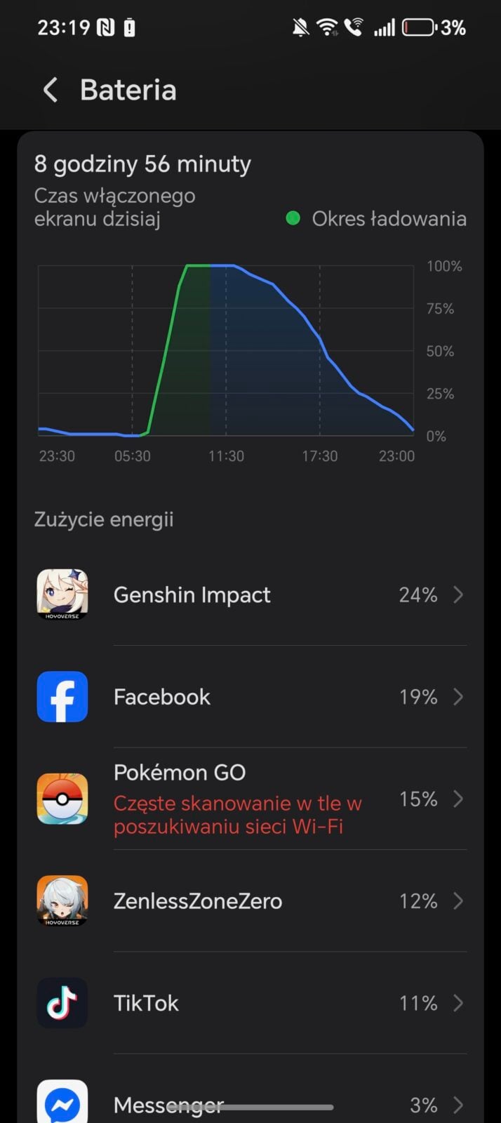 Niby wszyscy wiemy, że pojemność akumulatorów swoje, a czas pracy na jednym ładowaniu – swoje. Na szczęście 5820 mAh, jakie udało się wcisnąć Honorowi w tak ciasną obudowę, daje spokojny dzień korzystania – niezależnie od tego, czy korzystałem głównie z małego czy też dużego ekranu. Jeżeli nie korzystacie z mediów społecznościowych, telefon spokojnie poradzi sobie nawet przez 1,5 dnia – potrafiłem ładować go dopiero po 14:00 następnego dnia. W ujęciu godzinowym mogę spokojnie zapewnić o 7 godzinach z aktywnym ekranem. W intensywnych scenariuszach możemy zejść do 5 godzin, ale trzeba będzie się o to postarać angażującą rozgrywką i pobieraniem dużych plików.