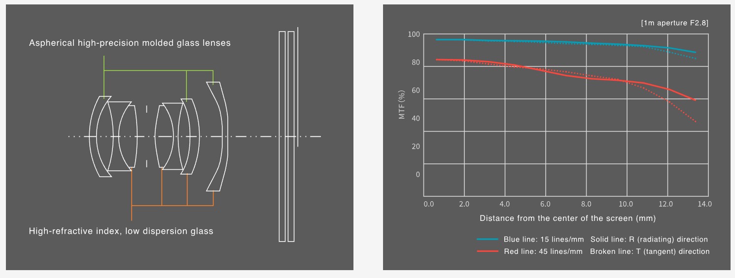 Obiektyw to tradycyjnie stałoogniskowy 18 mm f/2.8 (ekwiwalent 28 mm), ale o zupełnie zmienionej budowie – nowa konstrukcja składa się z 7 soczewek rozmieszczonych w 5 grupach, w tym 3 asferycznych i 4 ze szkła niskodyspersyjnego o wysokim współczynniku załamania. Konstrukcja będzie wzbogacona w standardowej wersji apartu o filtr szary 2 EV, a w wersji HDF o filtr dyfuzyjny. Maksymalnie można go będzie przymknąć do f/16. Migawka aparatu może pracować w zakresie 30 s-1/4000 s, przy czym dla przysłon jaśniejszych niż f/5.6 najkrótszy czas migawki wynosi 1/2500 s. Nowa konstrukcja także się szybciej składa i rozkłada, pozwalając na uruchomienie aparatu w 0,6 s.