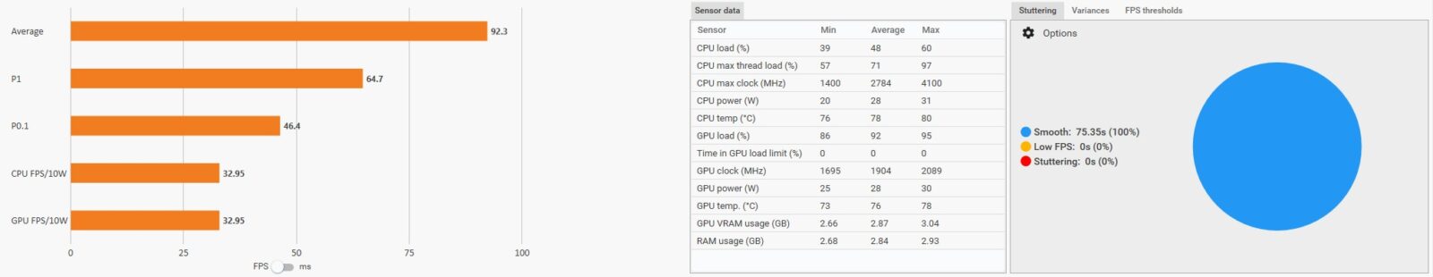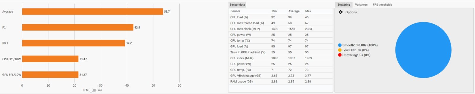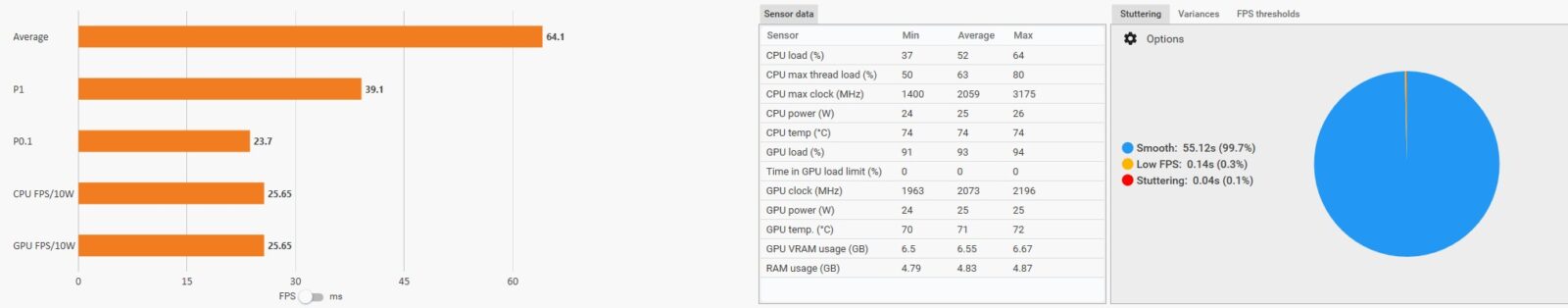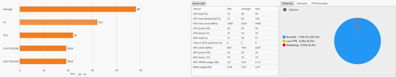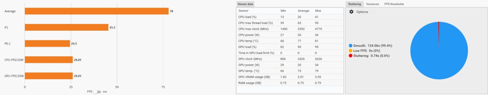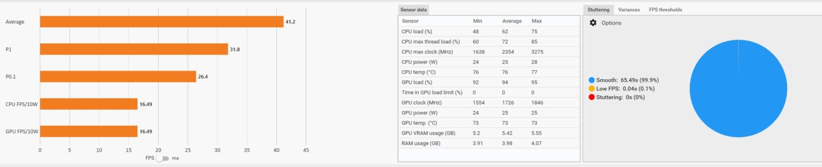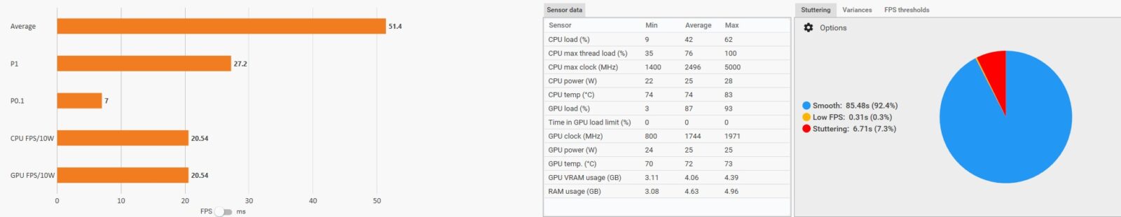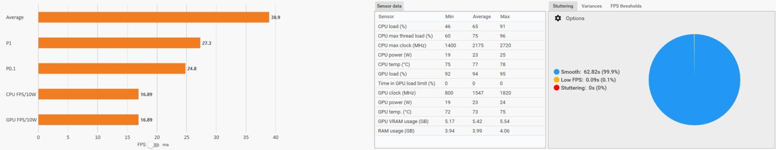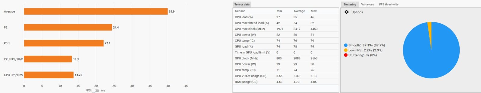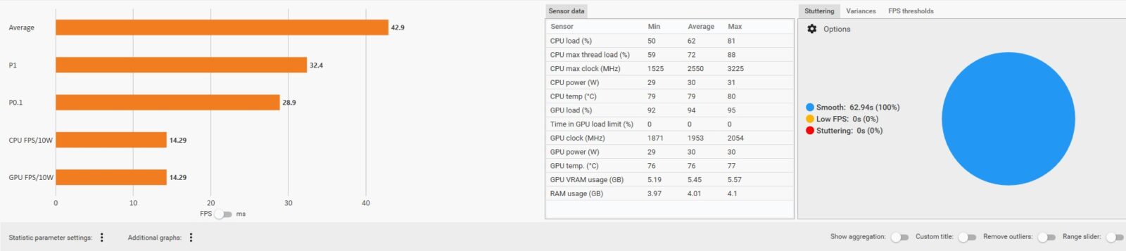 Tryby Turbo (25 W na akumulatorze i pełne Turbo z podłączonym zasilaniem) przynoszą dalsze, choć już mniej spektakularne wzrosty. Średnie FPS rosną nieznacznie, bo do ok. 42-43 – ale zyskujemy za to wyższe taktowania i większą stabilność w scenach z dużym obciążeniem CPU. To szczególnie istotne przy dynamicznych scenach walki lub intensywnych lokacjach miejskich. Ostatecznie więc Cyberpunk 2077 pokazuje, że ROG Ally X to sprzęt, który (o ile damy mu nieco więcej watów) potrafi zaoferować pełnoprawne doświadczenie z gry AAA.