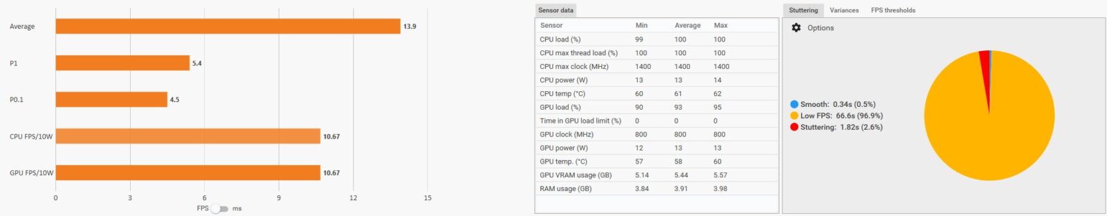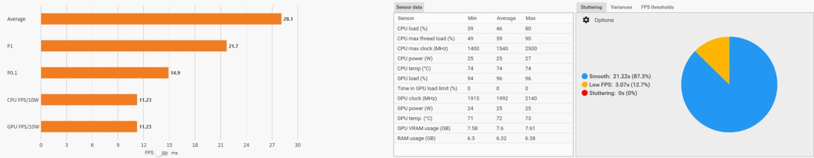 Wydajność Cyberpunk 2077 na ASUS ROG Ally X bardzo wyraźnie pokazuje, jak dużą różnicę robi zmiana trybu zasilania. W trybie cichym (13 W) gra działa co prawda płynnie z punktu widzenia animacji menu, ale rzeczywista rozgrywka przypomina pokaz slajdów – średnia to zaledwie 14 FPS i niemal cały czas spędzamy poniżej progu grywalności. Niskie zużycie energii (ok. 13-14 watów łącznie dla CPU i GPU) przekłada się na ograniczone taktowanie rdzenia graficznego do 800 MHz, co skutecznie dławi wydajność. Dopiero przejście na tryb zrównoważony (17 W) odblokowuje potencjał układu. Wzrost zegara GPU niemal dwukrotnie przekłada się na średnie 39 FPS i w pełni grywalną. To także pierwszy tryb, w którym VRR zaczyna spełniać swoją rolę, maskując drobne spadki płynności.