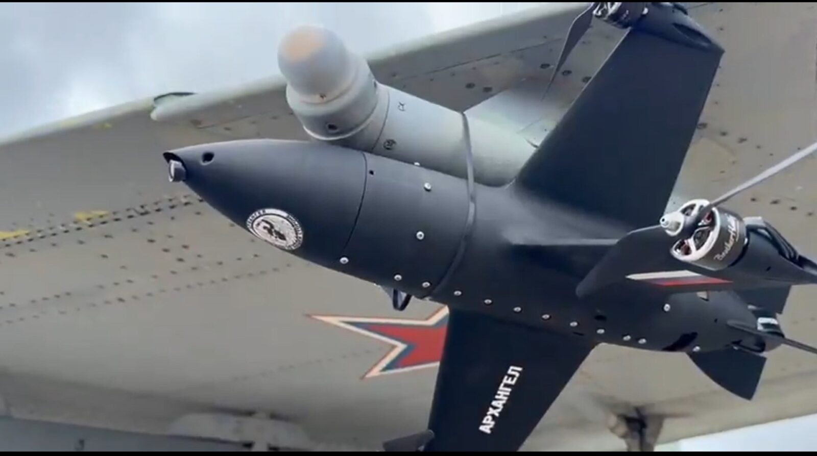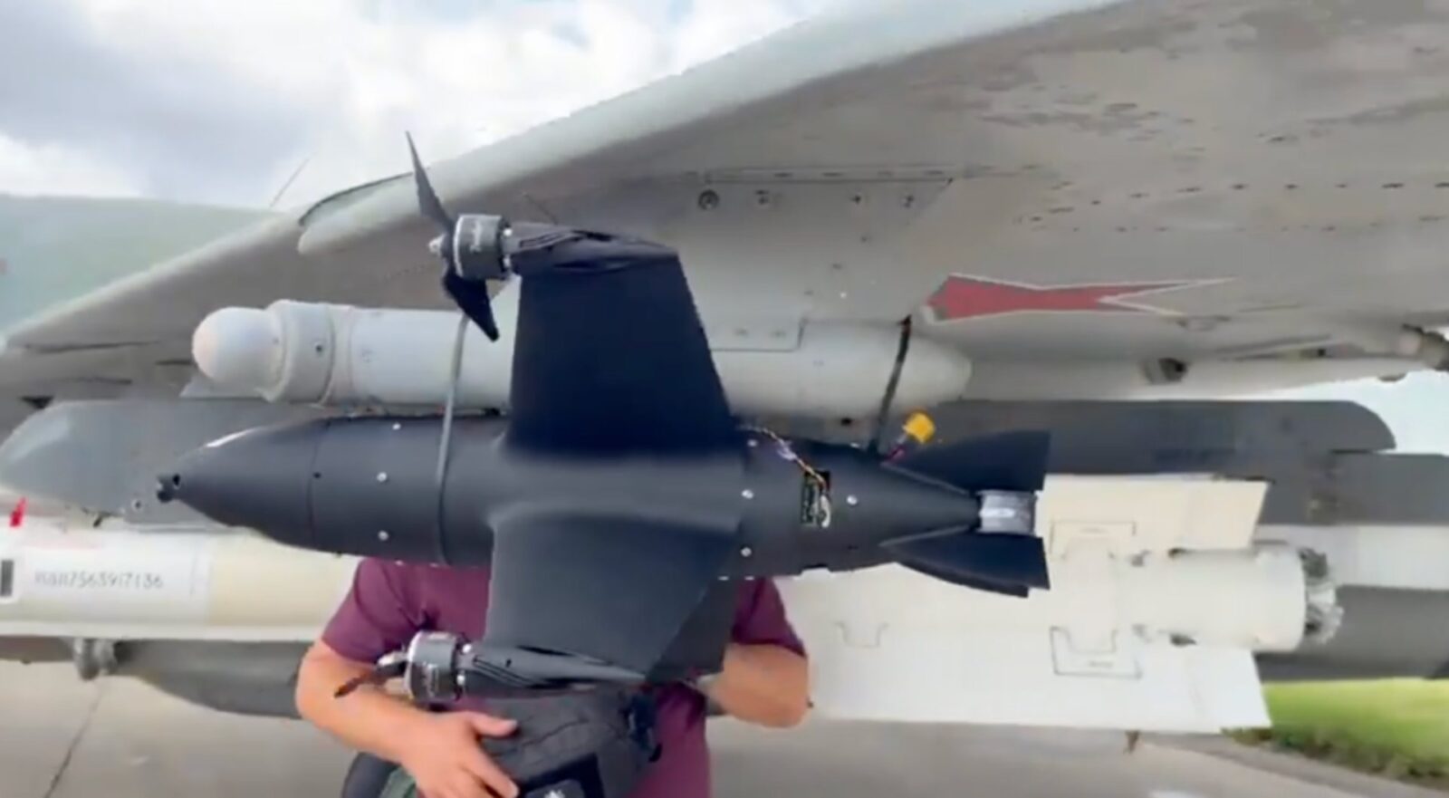 Zamiast osadzenia na nierzadko zaawansowanych pylonach, doczekał się ot… zestawu zwyczajnych opasek zaciskowych. Jest to rozwiązanie, które nie ma sensu nawet przy realizowaniu prostych prób w locie i wygląda raczej na naprędce doczepiony gadżet niż gotową do walki broń. Zwłaszcza że dron został umieszczony na obudowie czujnika systemu ostrzegania radarowego myśliwca, co natychmiast rodzi wątpliwości, czy w ogóle przetrwa lot z dużą prędkością, nie mówiąc już o skutecznym użyciu w walce.