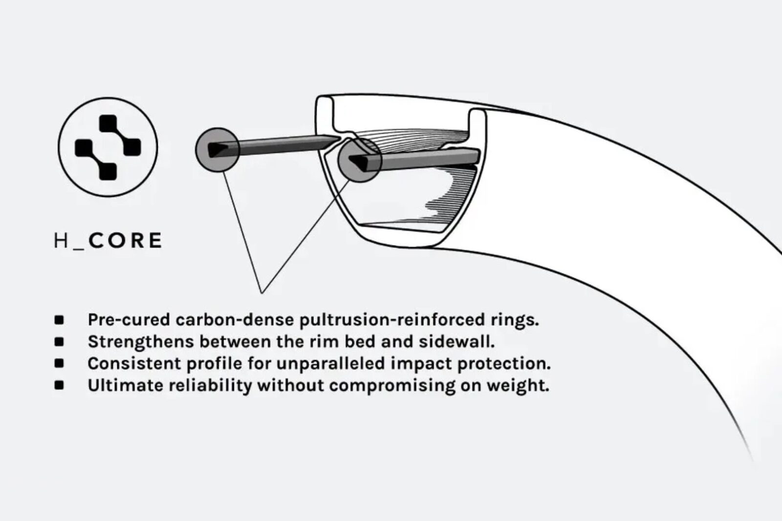Nowe obręcze firmy Hunt powstały z zastosowaniem technologii H‑Core, która została przeniesiona bezpośrednio z linii obręczy dedykowanej rowerom MTB. To w praktyce cienka warstwa włókna węglowego o wysokiej gęstości włókien, która jest umieszczona pomiędzy dnem a ścianką boczną obręczy. Zmniejsza ona zużycie żywicy w procesie produkcyjnym i znacząco poprawia odporność na uderzenia. Tak przynajmniej wynika z testów wewnętrznych producenta, wedle których nowe obręcze są tak samo trwałe jak modele do XC i down-country.