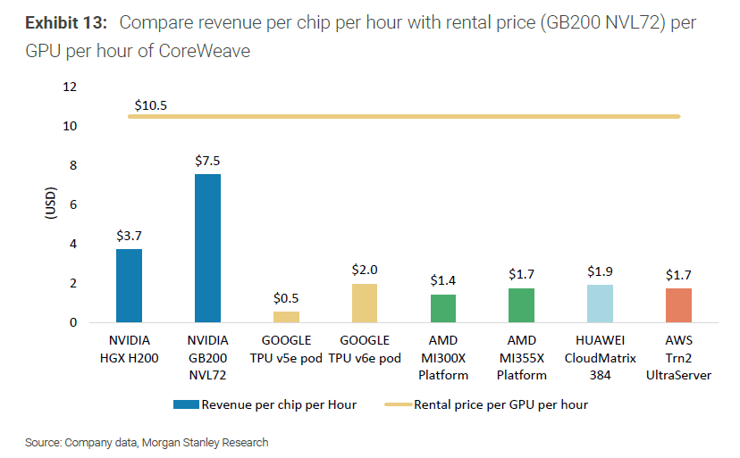Różnice w przychodach godzinowych są jeszcze bardziej uderzające. Układ grupy zielonych generuje 7,5 dolara przychodu na godzinę, podczas gdy druga w zestawieniu platforma tej samej firmy, HGX H200, osiąga 3,7 dolara. Sytuacja AMD prezentuje się zupełnie inaczej. Ich najnowsza platforma MI355X notuje ujemną marżę zysku wynoszącą 28,2%, co oznacza, że każda godzina pracy przynosi straty. Starsze rozwiązanie MI300X wypada jeszcze gorzej z wynikiem -64,0%. Godzinowy przychód platformy MI355X to zaledwie 1,7 dolara (około 6 złotych), czyli mniej niż ćwierć przychodu lidera rynku.
