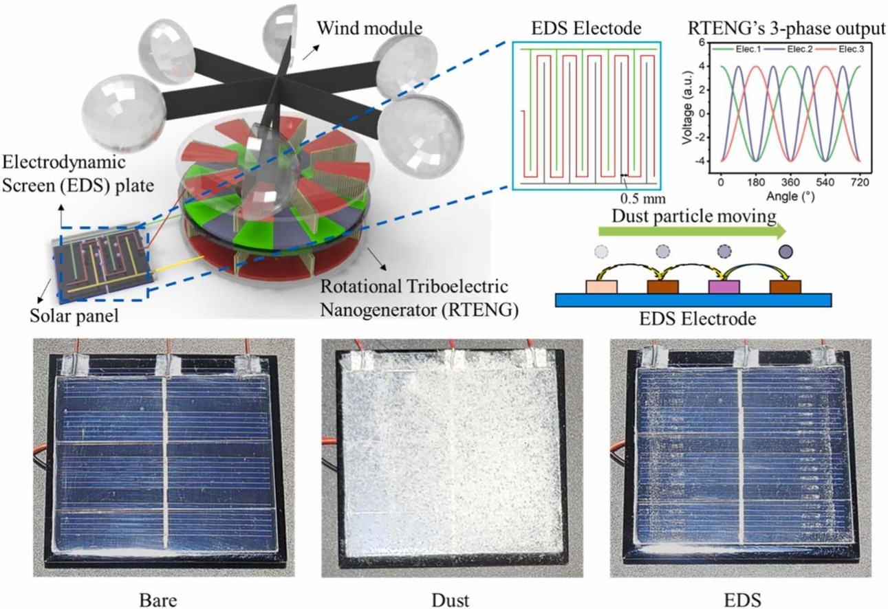 Sercem nowego rozwiązania jest obrotowy nanogenerator tryboelektryczny (RTENG), przekształcający energię mechaniczną z podmuchów wiatru w prąd elektryczny. Prawdziwa innowacja polega jednak na połączeniu RTENG z trójfazowym układem EDS, a to wzorem elektrod, które kierunkowo usuwają kurz z powierzchni panelu. Pierwotnie prototypy jednowazowe z 2024 roku powodowały jedynie oscylacyjne poruszanie się pyłu tam i z powrotem, licząc na grawitację. Ich skuteczność zależała od kąta nachylenia paneli, ale oto nowa konstrukcja z trójfazowym polem generuje siłę jednokierunkową, która przesuwa cząsteczki kurzu niezależnie od pozycji instalacji.