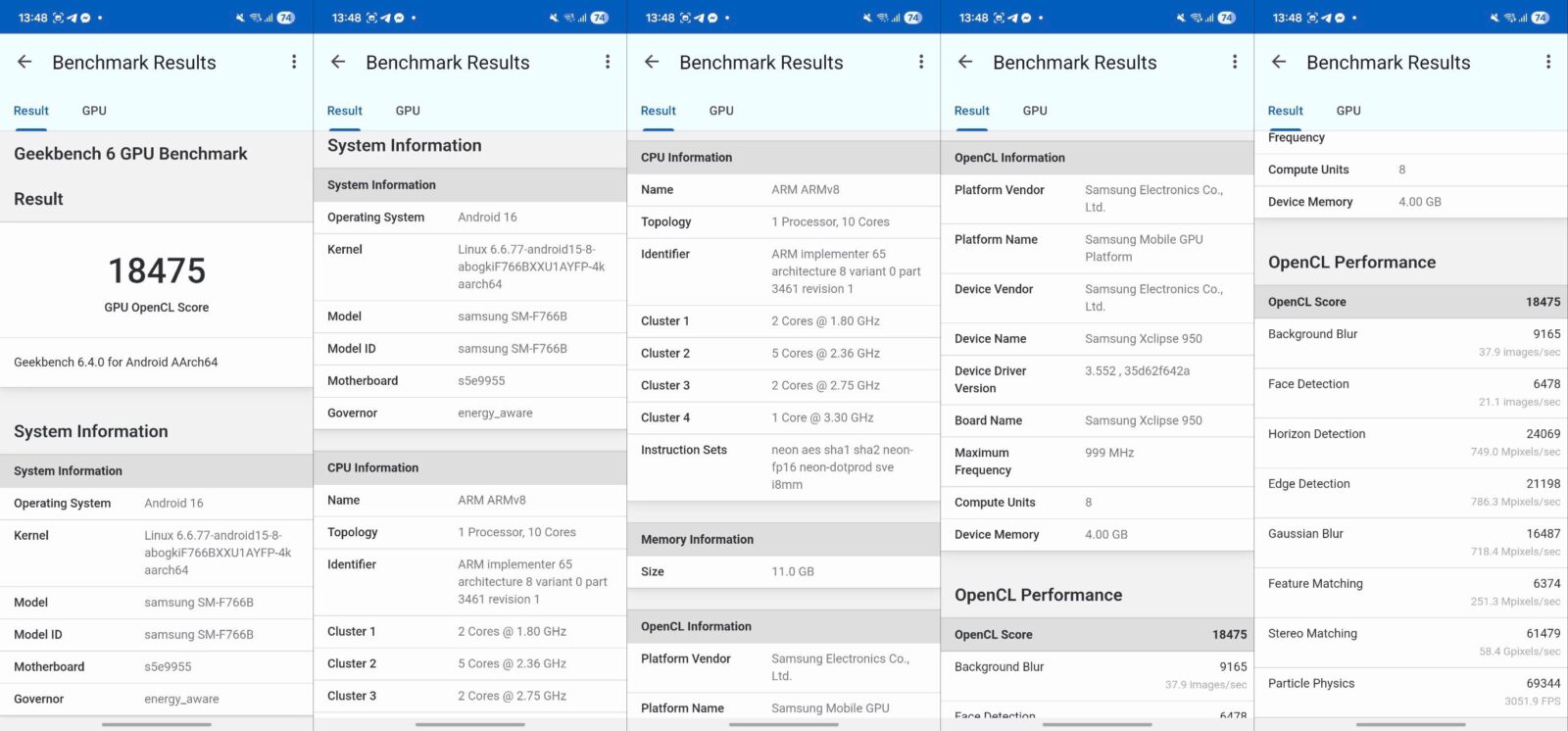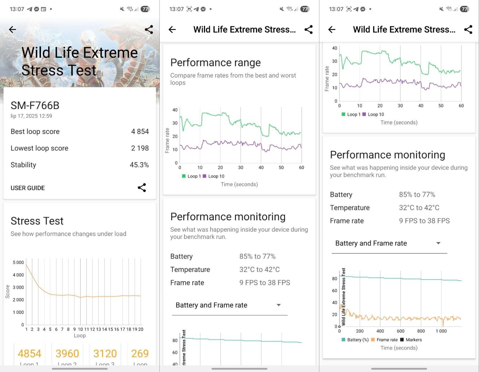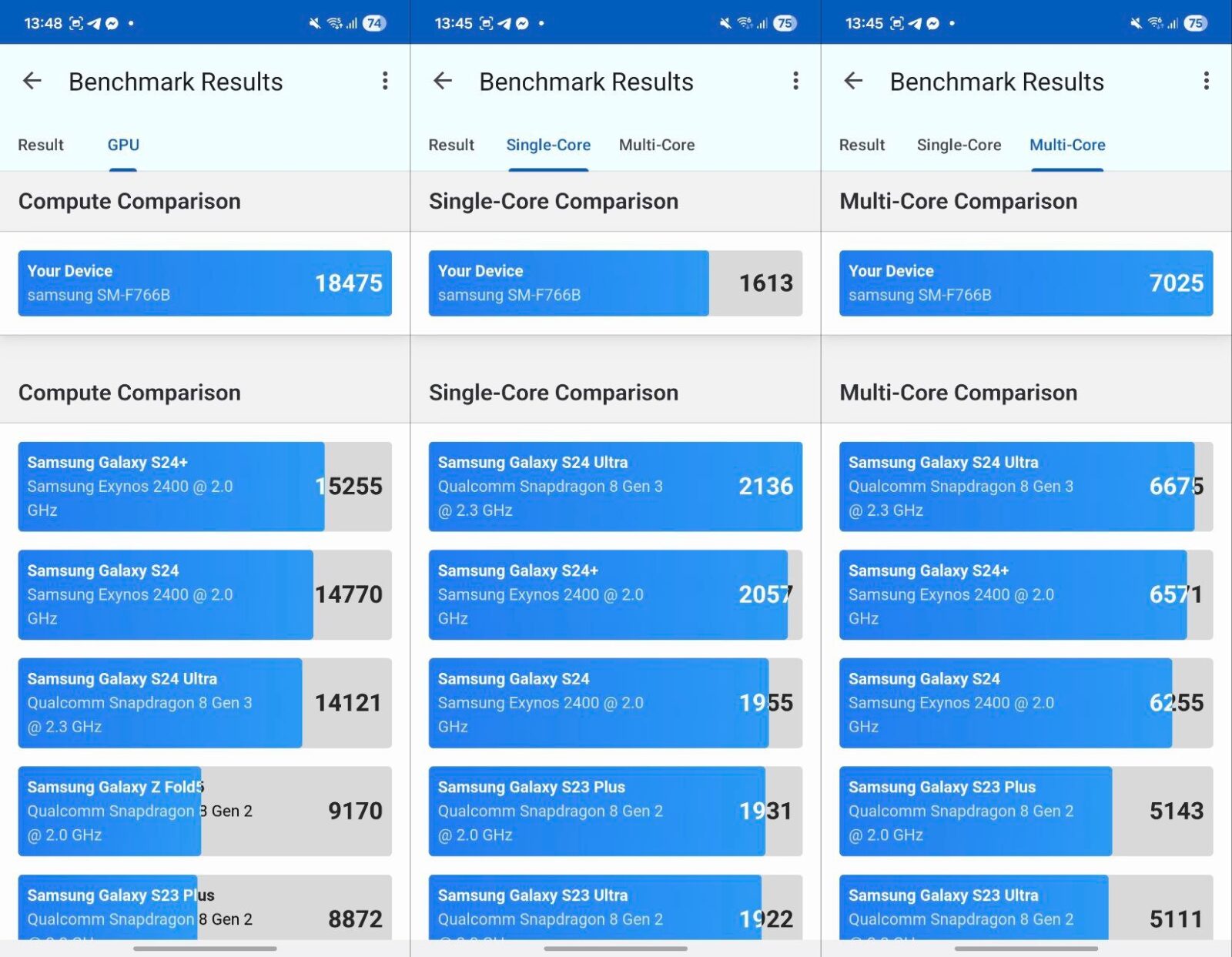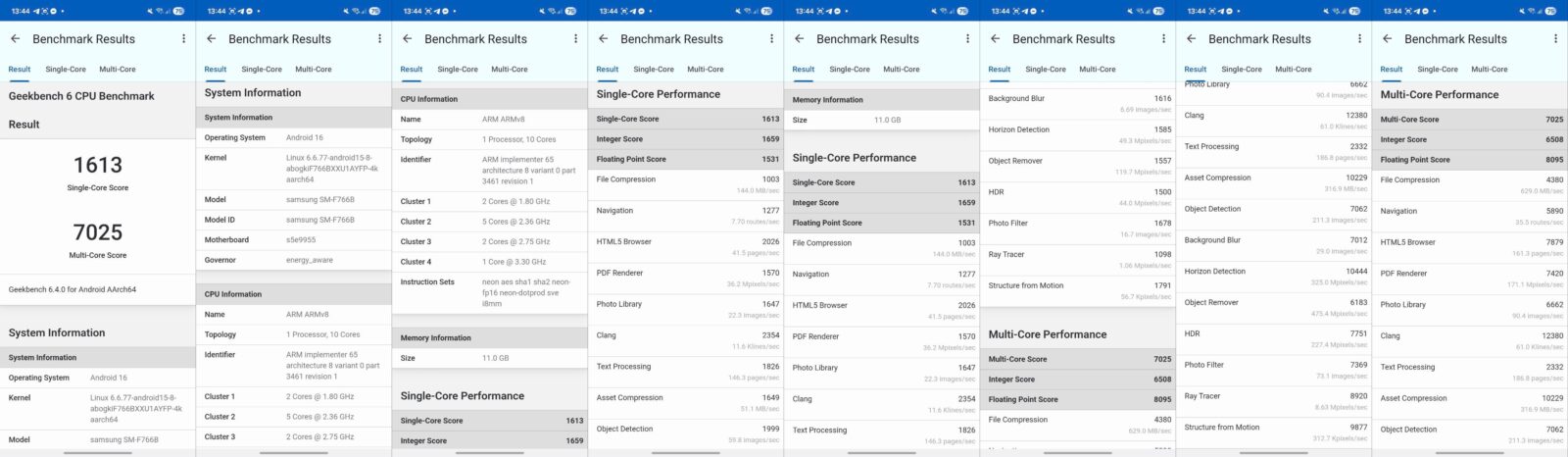 Pod maską Z Flip7 kryje się procesor Exynos 2500, wykonany w 3 nm procesie technologicznym, z 10-rdzeniową konfiguracją i GPU Xclipse 950. To dość zaskakujący wybór, szczególnie, że Z Fold7 korzysta ze Snapdragona 8 Elite — za to w jego mniejszym i tańszym rodzeństwie postawiono na autorski chip koreańskiej firmy. W codziennym użytkowaniu wydajność jest bez zarzutu i trudno na coś narzekać, chociaż w testach benchmarkowych ustępuje nieco rywalom. Wyniki możecie zobaczyć poniżej.