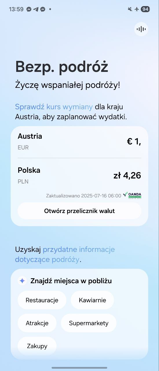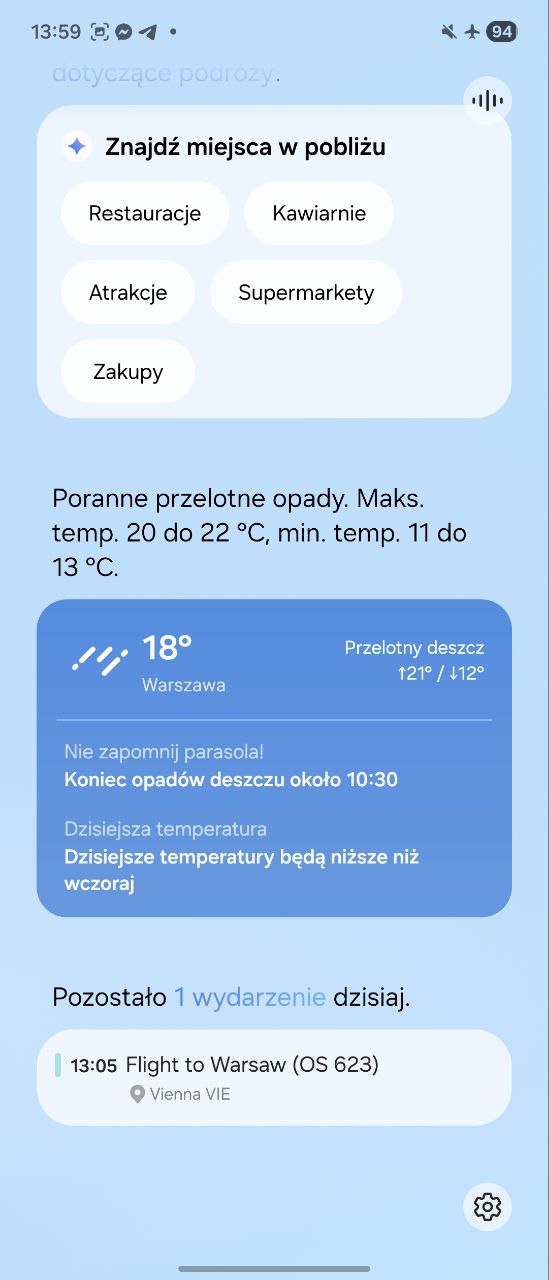 Na pokładzie jest również Now Bar, który życzy nam cały czas dobrego dnia i w postaci ładnych widżetów informuje nas o nadchodzących wydarzeniach, oraz Now Brief, który podsumowuje nasz nadchodzący dzień. Ta druga funkcja ma wszystko, żeby być całkiem przydatna, ale różnie z tym bywa — uporczywie zachęca mnie do korzystania ze Spotify, na którym nie jestem zalogowany i nie mam subskrypcji Premium, za to ignoruje sugestie z Apple Music, które mam zainstalowane i z którego korzystam na co dzień. Zabrałem także nowego Flipa w podróż i podczas pobytu w Austrii pokazywał mi obecny kurs euro, lokalną pogodę (co robi zawsze, bazując na lokalizacji), ale mylnie przez wszystkie dni wyjazdu życzył mi „miłej podróży”, chociaż miał w kalendarzu dokładnie wpisaną datę lotu powrotnego. Pomysł więc na plus, ale wymaga doszlifowania; na ten moment to raczej ciekawostka niż przydatny asystent w codzienności.