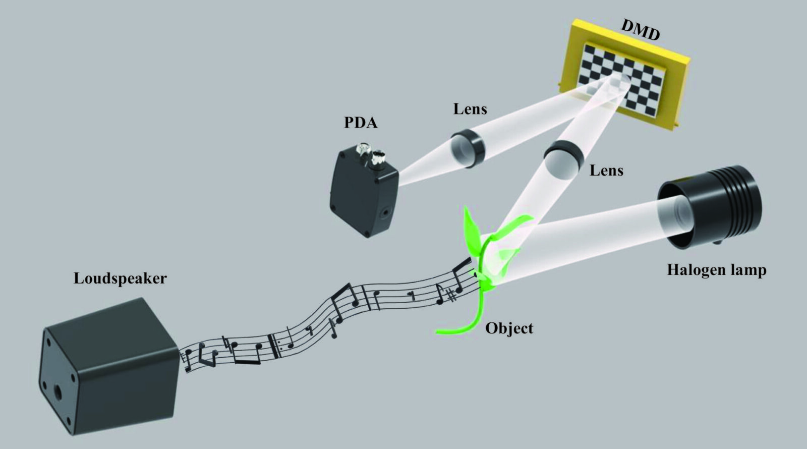Te drgania zmieniają sposób, w jaki powierzchnia odbija światło. Kluczowy element, szybki przestrzenny modulator światła, koduje te subtelne zmiany w odbitym świetle, które są następnie rejestrowane przez detektor jednopikselowy.