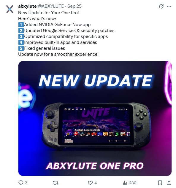 Najnowsza aktualizacja oprogramowania dla Abxylute One Pro wprowadza aplikację Nvidia GeForce Now, co zasadniczo poszerza funkcjonalność tego przenośnego urządzenia gamingowego. Poza główną nowością, użytkownicy zyskują także zaktualizowane usługi Google oraz najnowsze poprawki bezpieczeństwa.