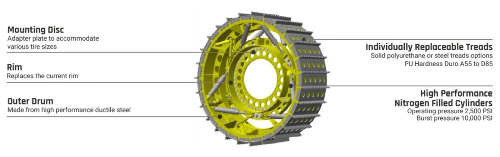 Konstrukcja tych kół jest dość nietypowa. Składają się one z wewnętrznej stalowej piasty połączonej z zewnętrznym bębnem za pomocą dwunastu cylindrów wypełnionych azotem i sześcioma amortyzatorami olejowymi. Jak wyjaśniają twórcy, tego typu mechaniczne rozwiązanie zapewnia tłumienie wibracji bez użycia powietrza pod ciśnieniem. Najciekawsze jest jednak to, że zewnętrzny bęben pokryty jest przykręcanymi bieżnikami z poliuretanu lub stali, które podobno wytrzymują nawet pięć razy dłużej niż standardowe opony gumowe.