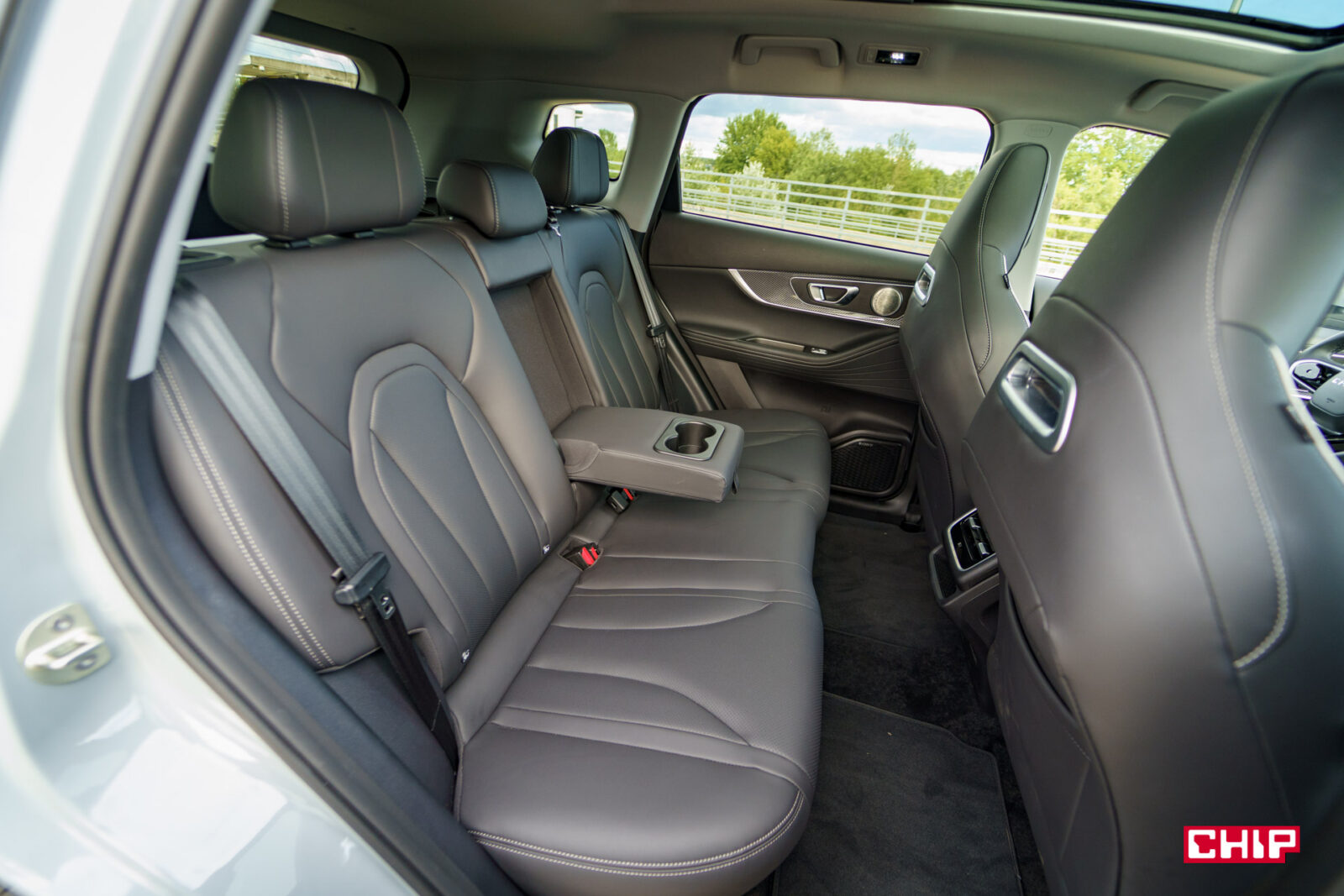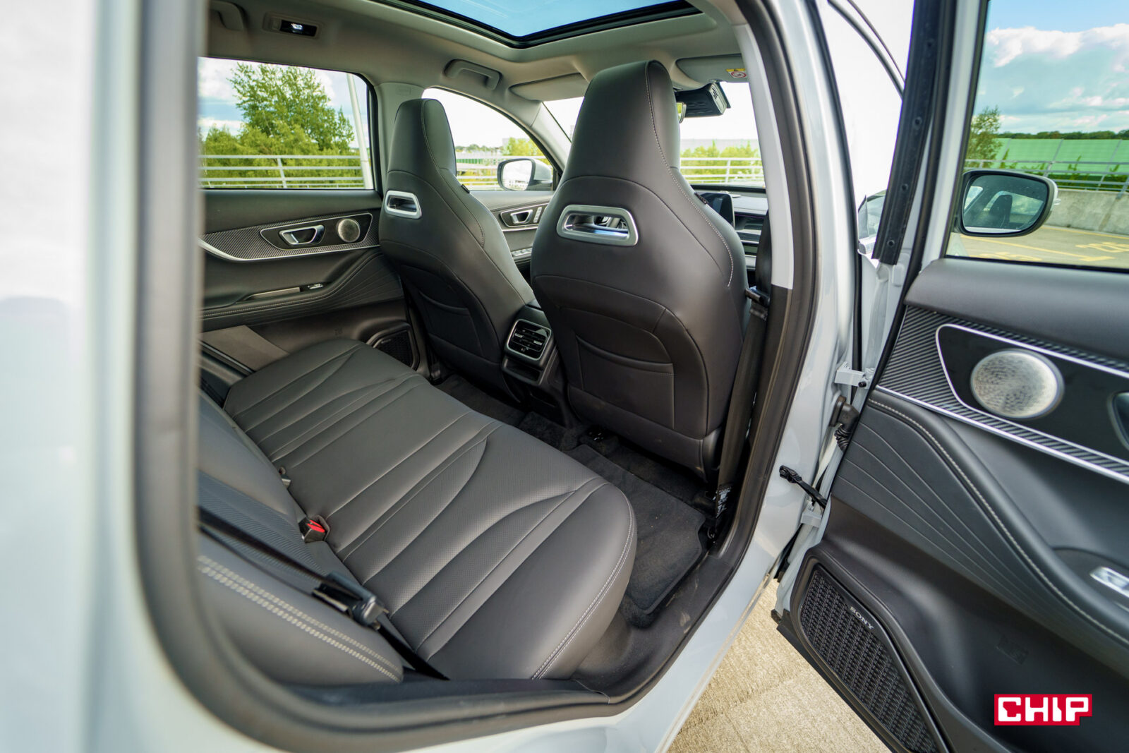 Tylna kanapa pomieści trzech dorosłych, z 950 mm na nogi, regulacją pochylenia i płaską podłogą — więc środkowy pasażer nie ma powodów do narzekania. Trójstrefowa klimatyzacja z nawiewami z tyłu to także bonus.