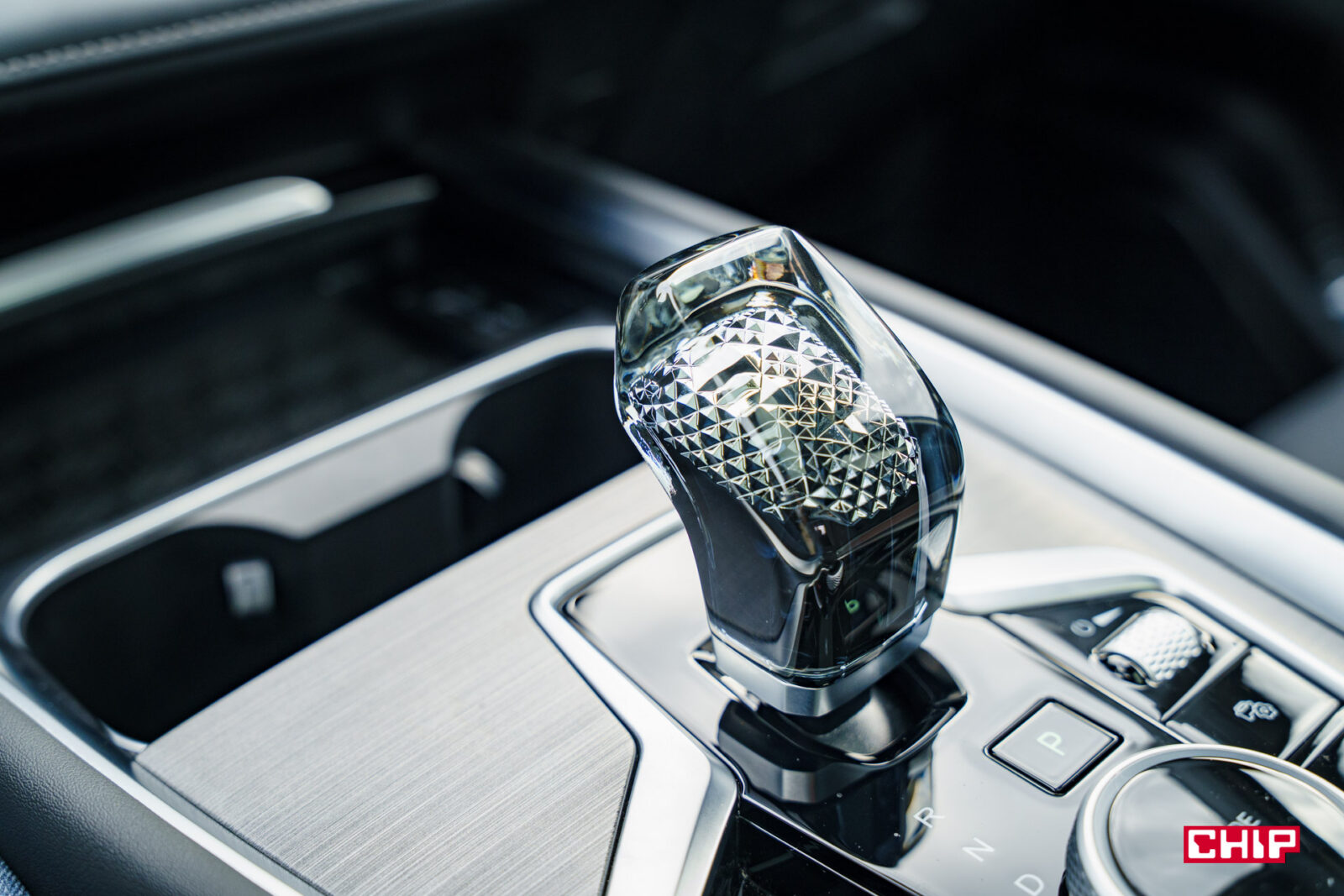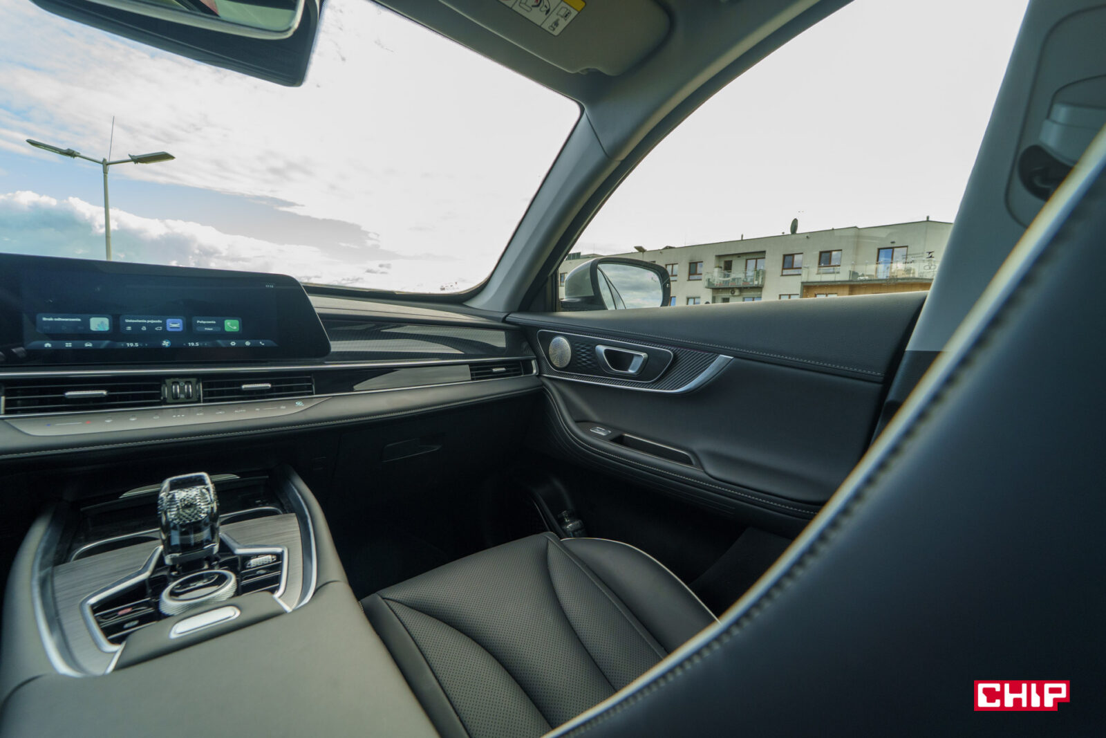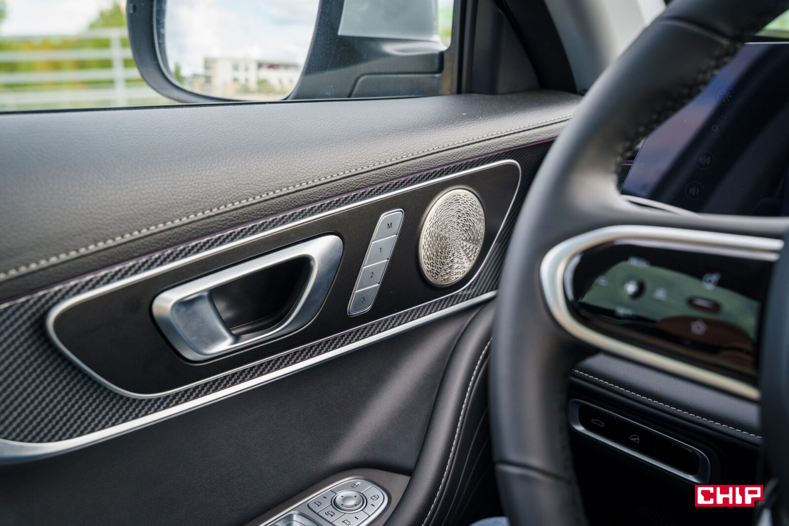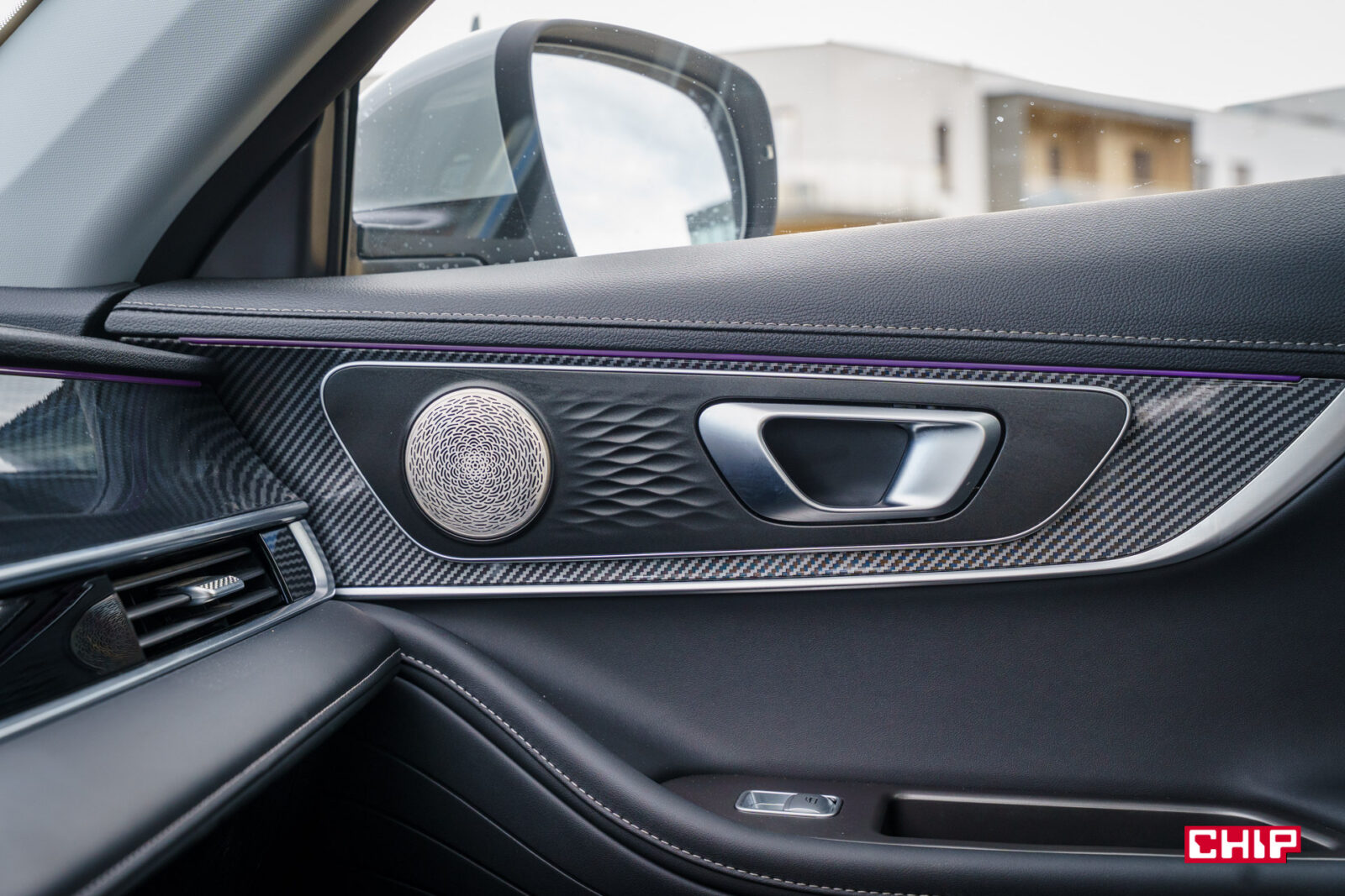 W śródtytule wspomniałem o szczypcie kiczu. I poza średnio trafionymi ekranami, jest tu kilka elementów, które są na granicy ciekawego designu a właśnie kiczowatej przesady. Do zmiany biegów w środkowym panelu jest… kryształową kulą, która wygląda zaskakująco pretensjonalnie i stara się być aż za bardzo bogata. Do tego głośniki na drzwiach ulokowane na podobnych do karbonu elementach wyglądają jak najbardziej ekwilibrystyczny koszmar trypofobów. Nie można zapomnieć o podświetleniu ambientowym, które ogólnie bardzo lubię i doceniam — a tutaj mamy też opcję, w której ambient reaguje na odtwarzaną muzykę. I w takim zestawie… brakuje tylko, żeby zmieniające się kolorowe światło odbijało się od kryształowej kuli na środku i robiło w środku dyskotekę. Lubię nowoczesny design, ale w tej kombinacji… trochę za dużo.