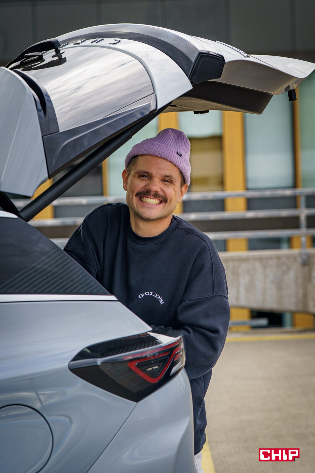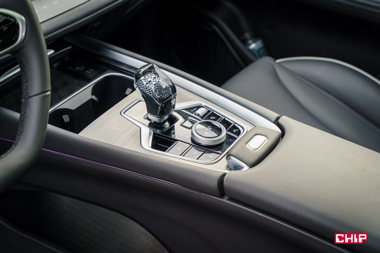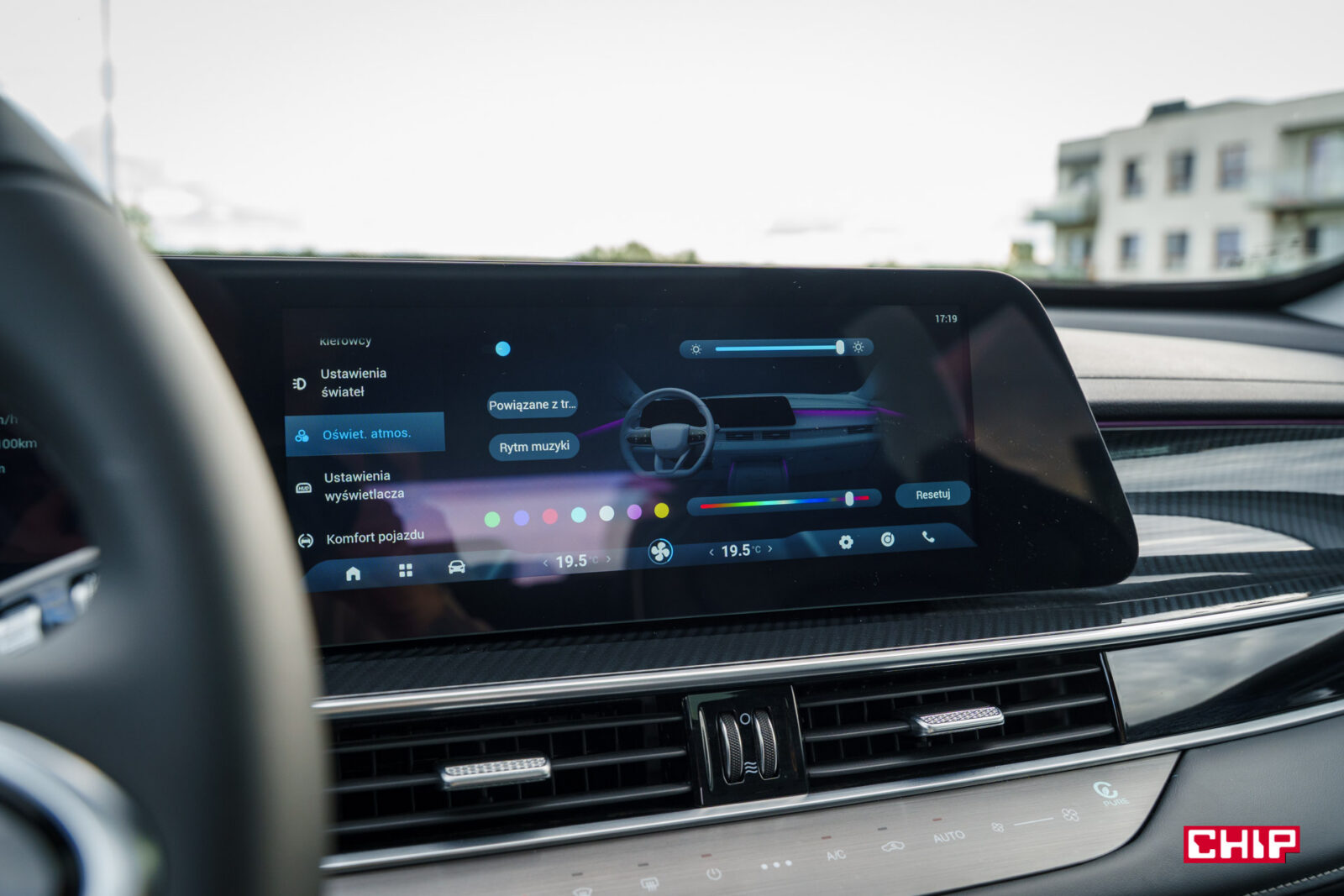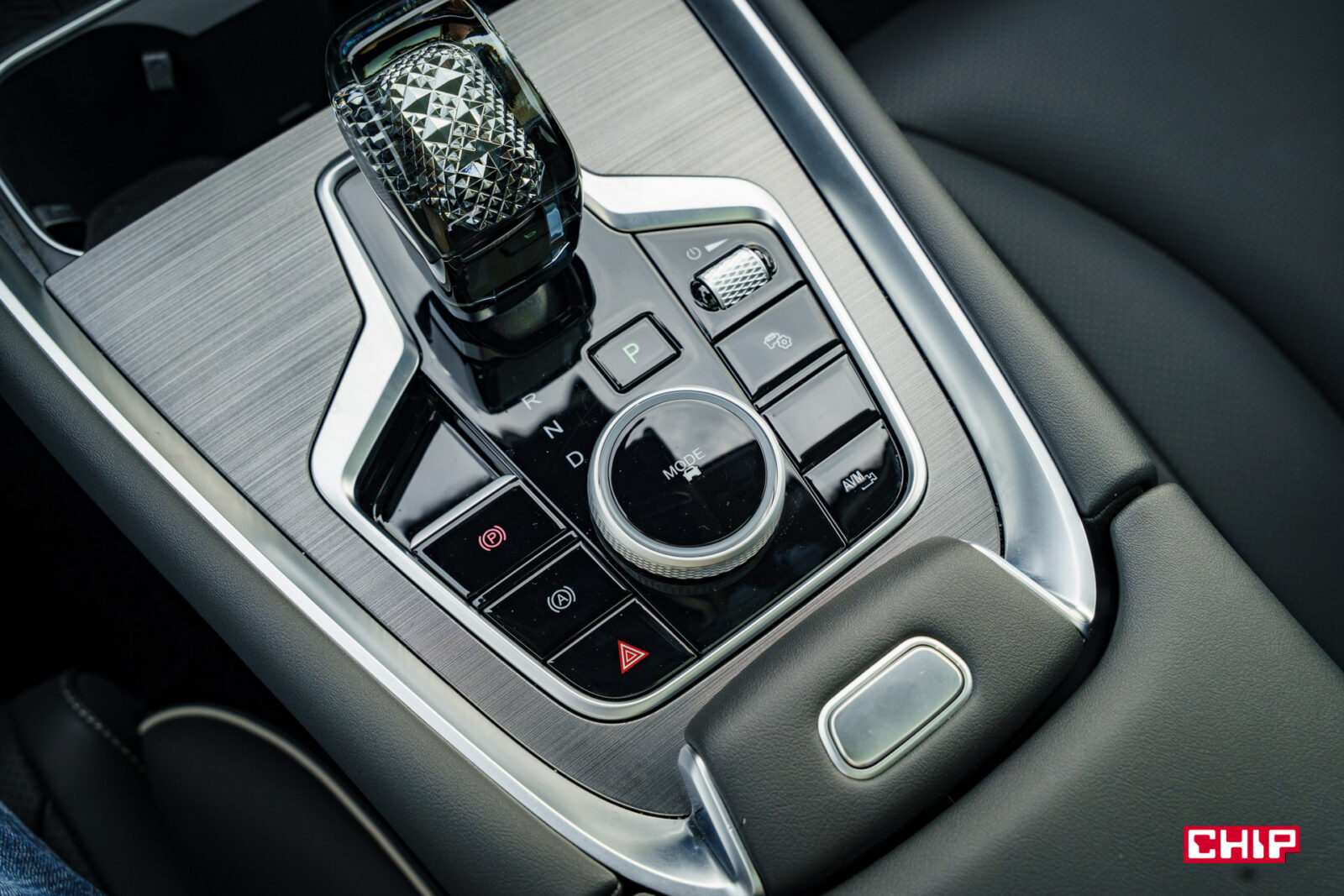 W śródtytule wspomniałem o szczypcie kiczu. I poza średnio trafionymi ekranami, jest tu kilka elementów, które są na granicy ciekawego designu a właśnie kiczowatej przesady. Do zmiany biegów w środkowym panelu jest… kryształową kulą, która wygląda zaskakująco pretensjonalnie i stara się być aż za bardzo bogata. Do tego głośniki na drzwiach ulokowane na podobnych do karbonu elementach wyglądają jak najbardziej ekwilibrystyczny koszmar trypofobów. Nie można zapomnieć o podświetleniu ambientowym, które ogólnie bardzo lubię i doceniam — a tutaj mamy też opcję, w której ambient reaguje na odtwarzaną muzykę. I w takim zestawie… brakuje tylko, żeby zmieniające się kolorowe światło odbijało się od kryształowej kuli na środku i robiło w środku dyskotekę. Lubię nowoczesny design, ale w tej kombinacji… trochę za dużo.