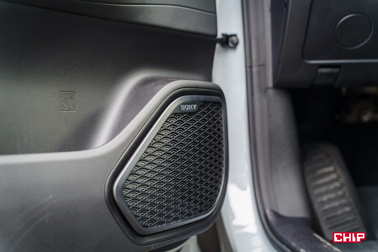 Nie mamy tu schowka na okulary ani żadnego klipsa w osłonie przeciwsłonecznej na karty paliwowe czy bilety parkingowe, za co mały minus. Z drugiej jednak strony mamy najbardziej wypasione lusterko jakie kiedykolwiek widziałem, bo jest podświetlane dookoła i możemy nawet zmieniać, czy chcemy ciepłą czy zimną barwę światła. Audio zapewnia 9 głośników Sony (w niższych wersjach wyposażenia mamy kolejno 6 głośników bez podania konkretnej marki lub 8 głośników Sony) gra czysto i nie można się tu do czegokolwiek przyczepić. Wyciszenie kabiny jest poprawne, nawet przy prędkościach autostradowych — w środku więc jest nie tylko przestronnie, ale też całkiem cicho. To się ceni.