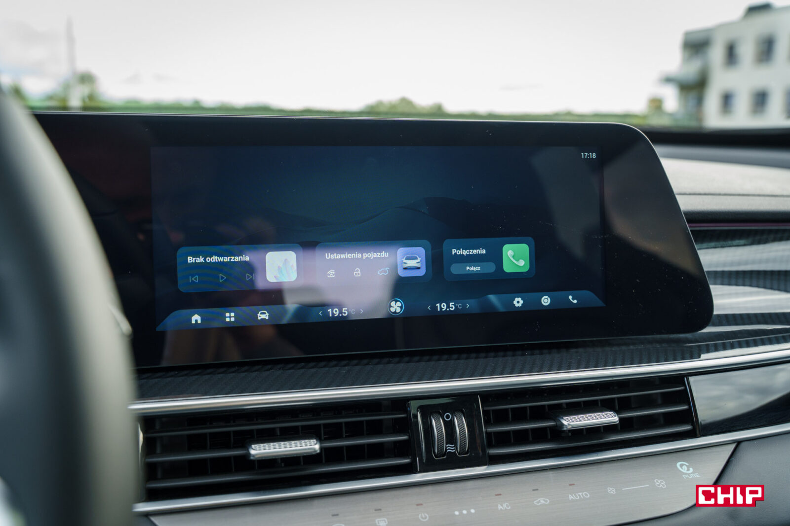 Pod ekranami mamy mały panel z dotykowymi przyciskami od sterowania klimatyzacją na materiale imitującym drewno. Można się zastanowić, komu to jest do czegokolwiek potrzebne, ale w tym przypadku bardzo się przydaje — dlatego, że kiedy korzystamy z Apple CarPlay czy Android Auto, to klonowanie ekranu smartfona zajmuje całą powierzchnię wyświetlacza. Co za tym idzie, wyklikanie ustawień klimatyzacji nie należy do najbardziej komfortowych, szczególnie podczas jazdy. Wybierając jednak zmianę temperatury którąś ze strzałek z poziomu dotykowego panelu poniżej, wywołujemy ustawienia klimy. Nie sądzę, żeby było to projektowane pod tym kątem — ale hej, działa!