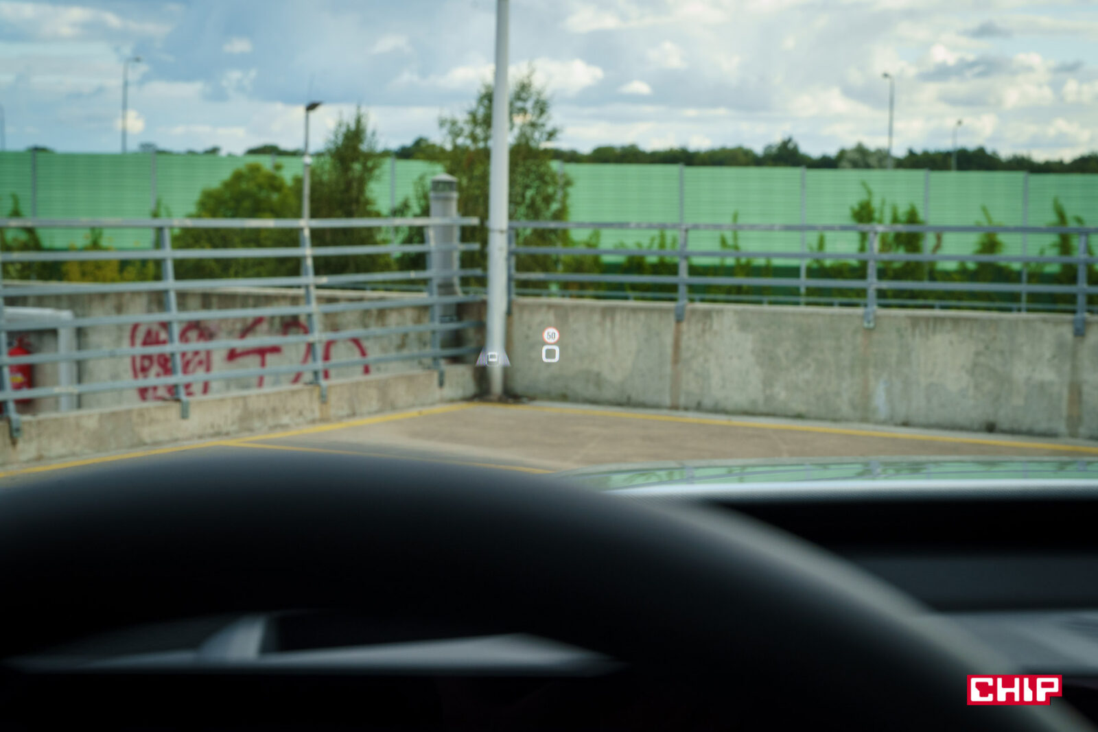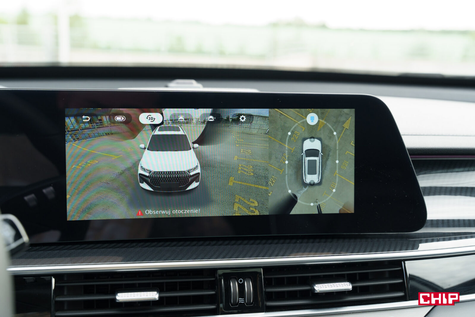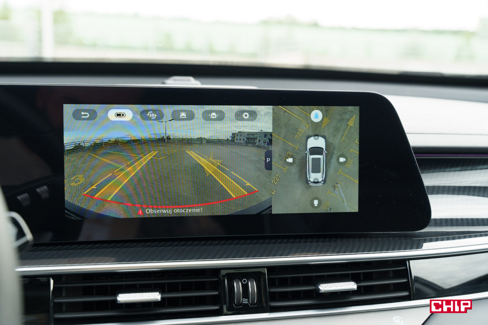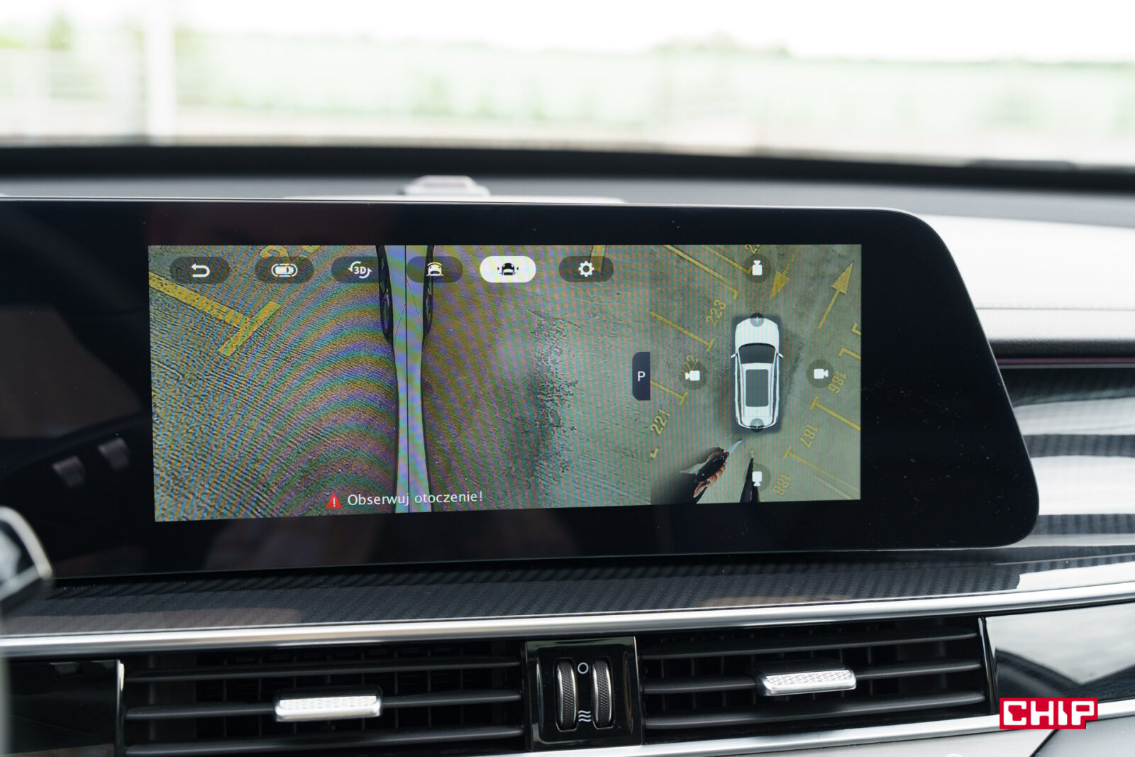 Head-up display w Prestige jest czytelny, z regulacją jasności i wysokości. System kamer 540° to niezmiennie hit — parkowanie w ciasnych warszawskich garażach to bułka z masłem, a jakość obrazu oraz płynność animacji jest lepsza, niż w wielu zdecydowanie droższych europejskich samochodach. Dalej tylko nie potrafię zrozumieć, dlaczego nie ma tutaj asystenta parkowania, tak jak w Jaecoo 7. Skoro ten samochód jest obklejony kamerami i czujnikami, to nie ma żadnego racjonalnego powodu, żeby nie mógł parkować sam. To największy technologiczny zgrzyt w Tiggo 7. Co ciekawe, rozmawiałem z osobą pracującą w salonie Omody i Jaecoo i dowiedziałem się, że koncern Chery traktuje to rozwiązanie jako funkcję premium, która jest dostępna w droższych samochodach, jak na przykład Omoda 9 Super Hybrid. Z jednej strony rozumiem, z drugiej — wielka szkoda, szczególnie, że taki Beijing 7 asystenta parkowania posiada. I radzi sobie całkiem nieźle.