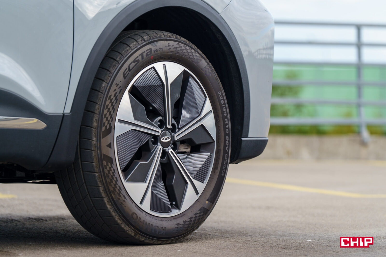 Boki to smukłe linie, chromowane listwy i 19-calowe felgi (18 cali w niższych liniach wyposażenia niż Prestige), które dobrze komponują się z proporcjami. Same felgi również wyglądają bardzo intrygująco, nieco futurystycznie i dobrze komponują się z całym samochodem — chociaż mają na tyle ciekawe wzornictwo, że kiedy przyjechałem z parku prasowego do parkingu podziemnego naszego biura, to wraz z Arkiem z naszej redakcji obchodząc i oglądając samochód, mieliśmy chwilowe załamanie, że felga jest solidnie wgnieciona. Także przy pierwszym kontakcie z Tiggo 7 — uspokajam, to tak ma być!