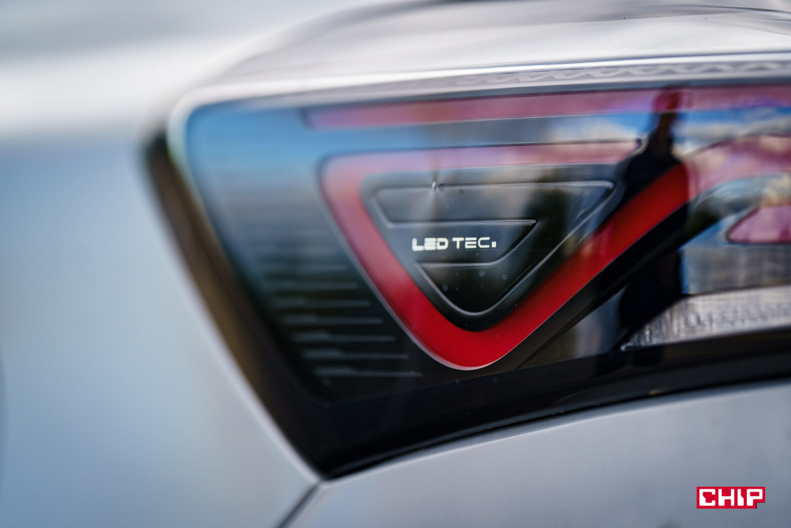 Z tyłu mamy już szeroką listwę LED, która łączy się z lampami. Te są wyjątkowo ciekawe w tym samochodzie — jak nauczyło nas chociażby Jaecoo 7 ze swoimi pikselowymi światłami z przodu, grupa Chery lubi nieco eksperymentować z oświetleniem. W Tiggo 7 widać to z tyłu, chociaż trudno mi opisać, co dokładnie te światła prezentują. Bliżej nieokreślona wizja artystyczna lub szalony warkocz to jedyne, co przychodzi mi do głowy. Na pewno jednak wygląda to naprawdę dobrze. Nad listwą świetlną nie znajdziemy logo marki, a dumny napis CHERY. Ja jeździłem wersją z samym silnikiem spalinowym, i jak dynamika jazdy naturalnie na tym traci względem hybrydy, tak dzięki temu nie było z tyłu tego wielkiego emblematu z napisem HYBRID, który straszył w Tiggo 8 — więc do designu tyłu tego samochodu absolutnie nie mogę się przyczepić.