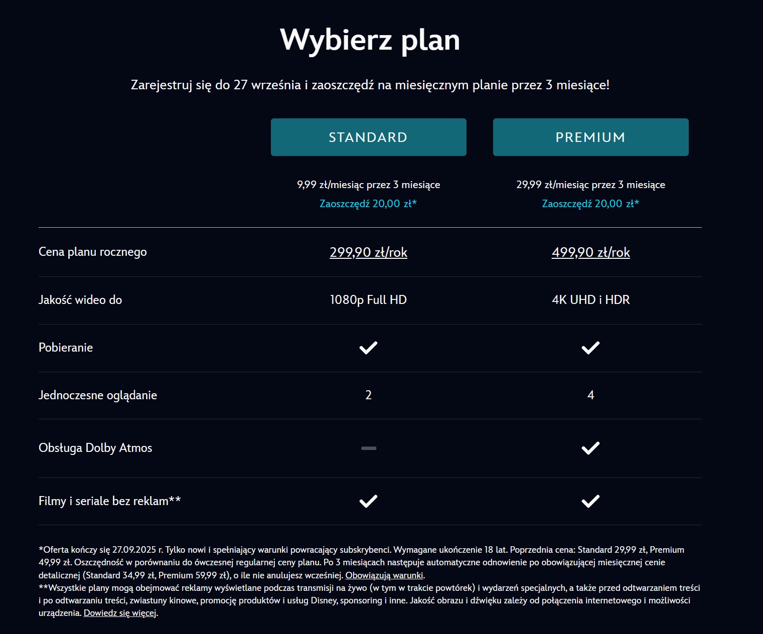 Disney próbuje zachęcać do subskrypcji, uruchamiając promocyjną ofertę, która potrwa do 27 września. Mogą z niej skorzystać nowi użytkownicy oraz osoby, które wcześniej zrezygnowały z usługi. Obniżka wynosi 20 złotych miesięcznie przez pierwsze trzy miesiące i obowiązuje dla obu planów – Standard w promocji kosztuje 9,99 zł zamiast 29,99 zł, a Premium – 29,99 zł zamiast 49,99 zł. Po trzech miesiącach abonament automatycznie przechodzi na nowe, wyższe stawki, o ile użytkownik nie zrezygnuje wcześniej z usługi.