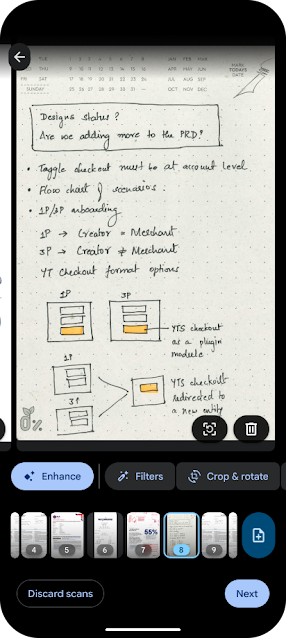Najbardziej rzucającym się w oczy ulepszeniem jest znaczne powiększenie podglądów stron, które w nowej wersji zajmują około trzech czwartych ekranu, zamiast połowy – zdecydowanie ułatwia to ocenę jakości skanu pod kątem szczegółów i ewentualne podjęcie decyzji o konieczności zrobienia powtórki. Przejście między stronami stało się płynniejsze, a opcje usuwania lub ponownego skanowania strony są teraz wyraźniej widoczne w prawym dolnym rogu. Podgląd całego przechwyconego dokumentu ma teraz formę poręcznej karuzeli miniatur na dole ekranu – w nowej wersji znacznie łatwiej przejrzeć wszystkie przechwycone strony i w razie potrzeby zmienić ich kolejność.