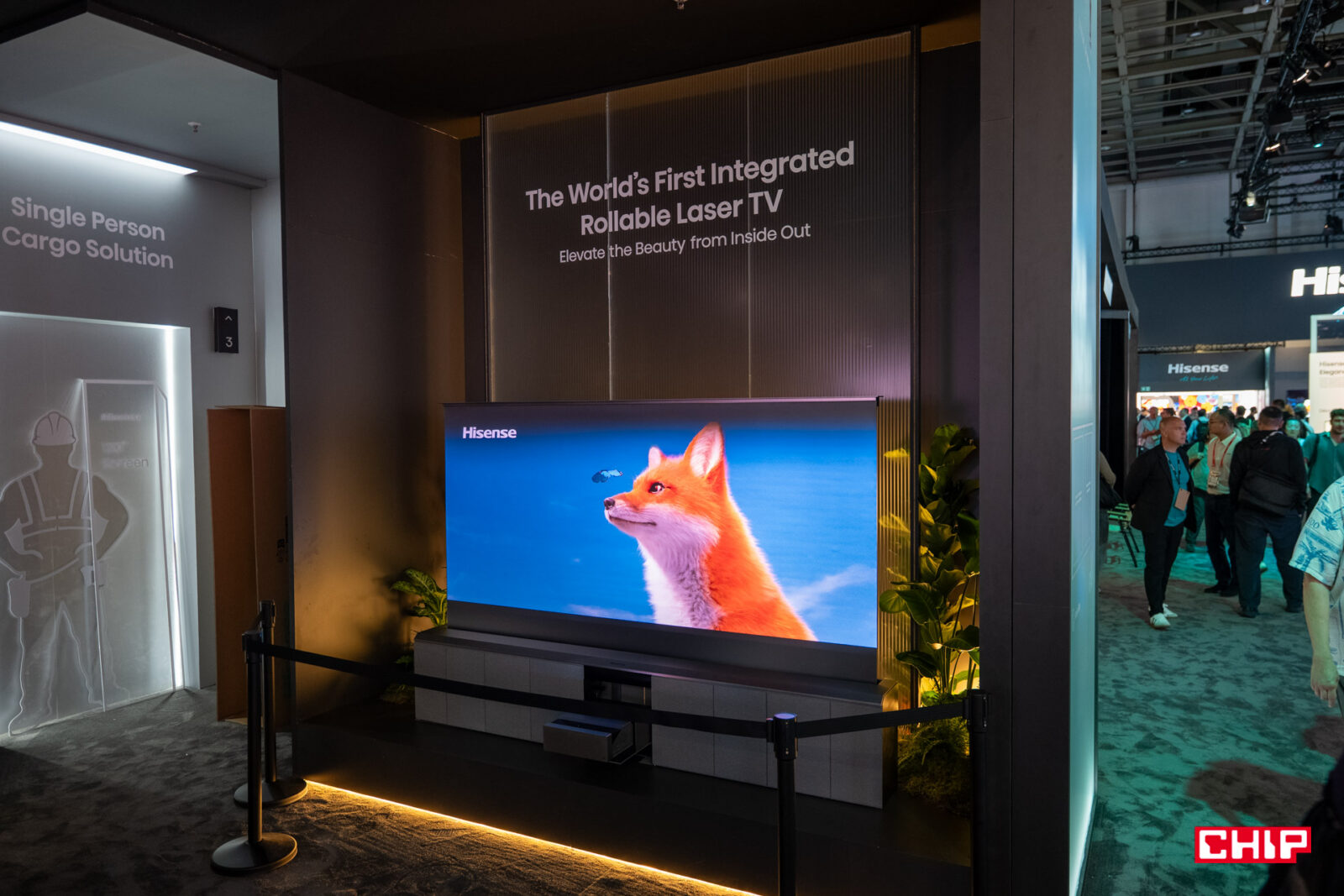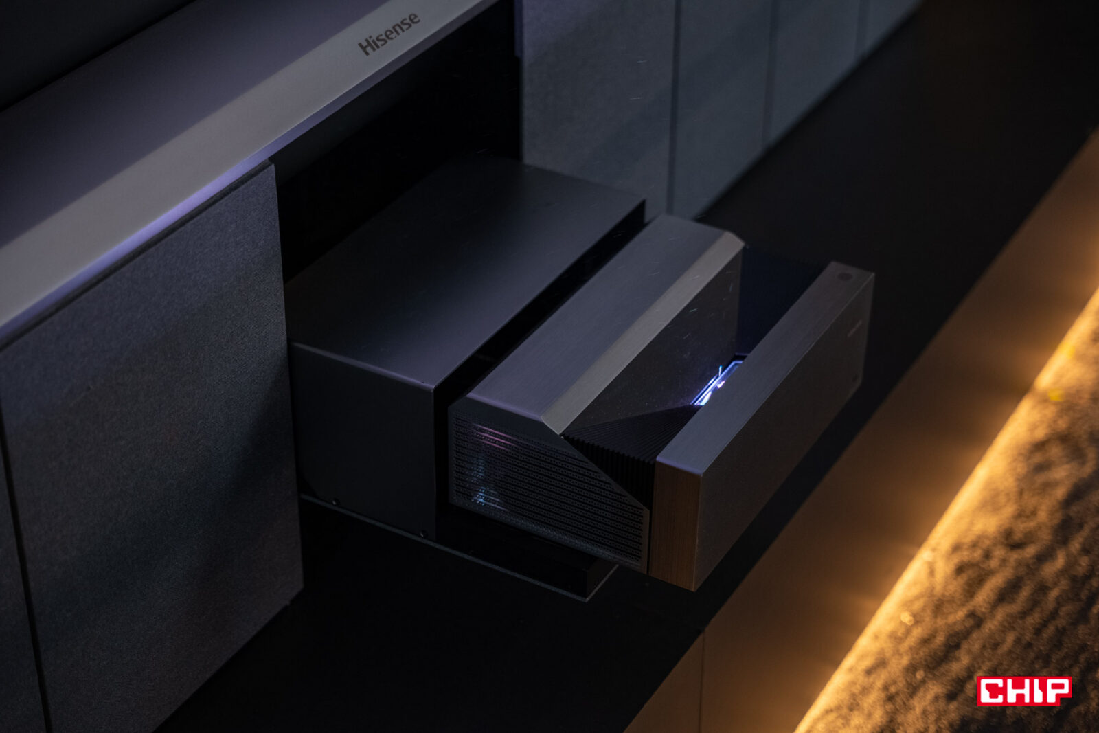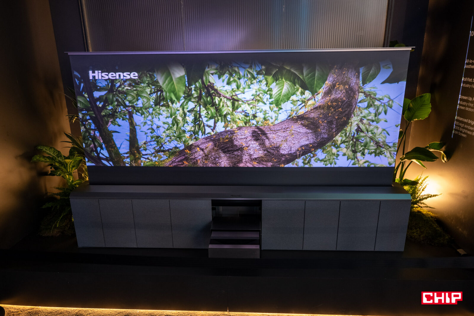 Widać, że Hisense nieustannie eksperymentuje z formami. Producent stworzył pierwszy na świecie zintegrowany system 100-calowego ekranu i projektora laserowego. Całość laserowego telewizora może się schować wewnątrz szafki, a gdy tylko chcemy wyświetlić treści – rozwinąć się, oferując minimalistyczne doświadczenie przy dużej przekątnej. Nieco przypomina to o zwijanych telewizorach, które w pojedynczych sztukach trafiają na rynek, ale w tym przypadku awaria ekranu niemal z pewnością będzie tańsza.