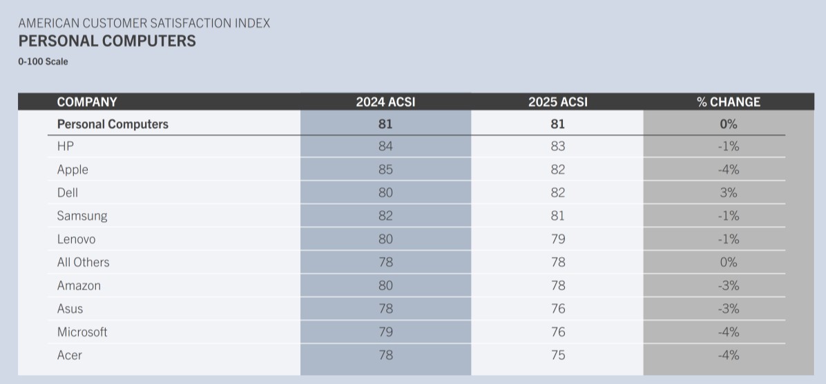 Pełne zestawienie ACSI 2025 prezentuje się następująco: Samsung z wynikiem 81 punktów, Lenovo z 79, Amazon z 78, natomiast Asus i Microsoft dzielą pozycję z wynikiem 76 punktów każdy. Na końcu rankingu znalazł się Acer z rezultatem 75 punktów. Największe spadki dotknęły nie tylko Apple, ale także Microsoft i Acer, taka sytuacja może wskazywać na systemowe wyzwania w podejściu do relacji z klientami w całej branży.