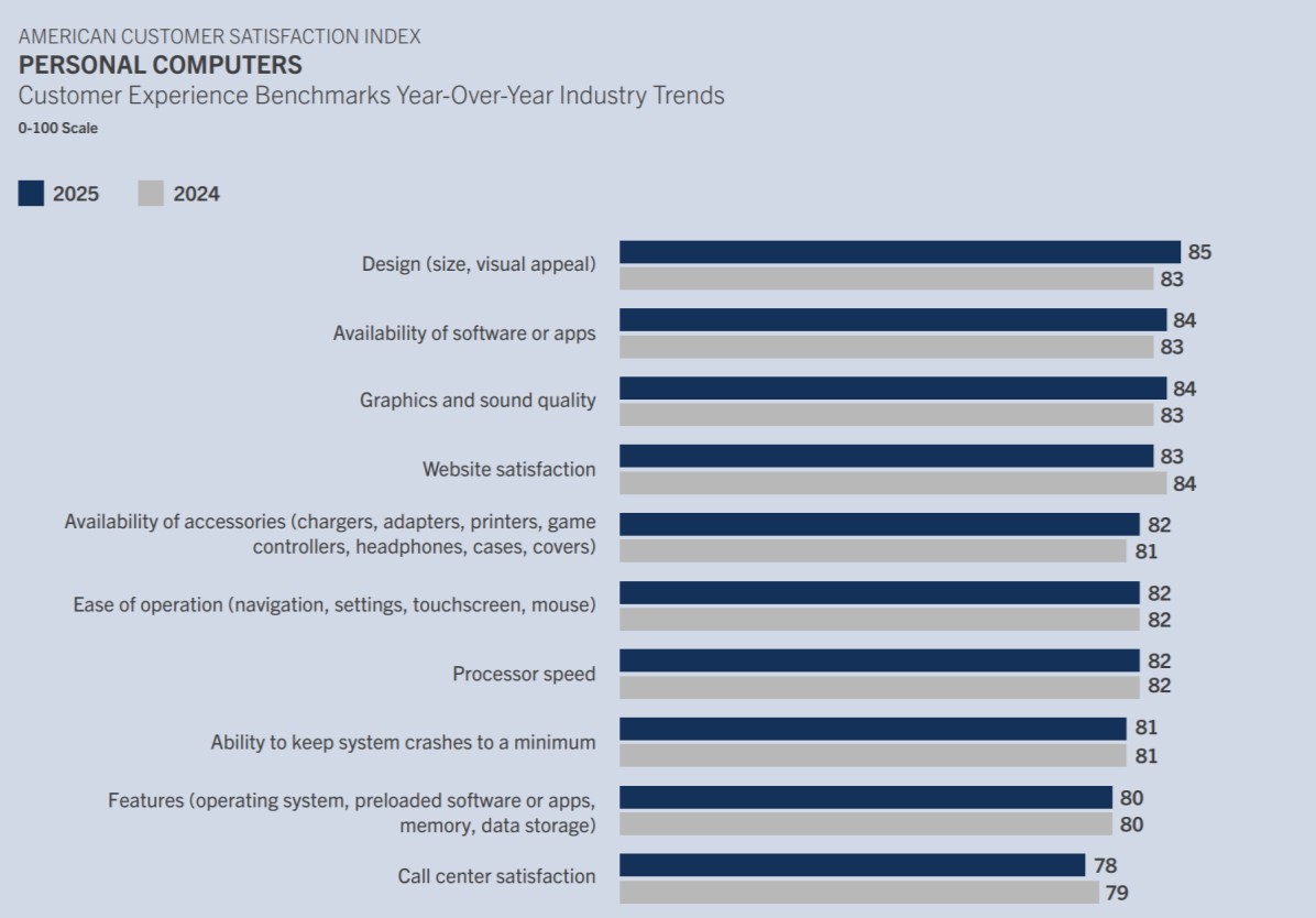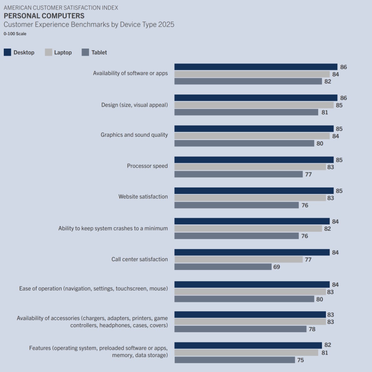 Jeśli sytuacja w segmencie komputerów osobistych wydaje się trudna, to rynek tabletów przeżywa prawdziwy kryzys. Satysfakcja klientów spadła dramatycznie z 81 punktów w 2024 roku do zaledwie 77 punktów w obecnym badaniu. To jeden z najsłabszych wyników w historii tej kategorii produktów. Warto również zwrócić uwagę na ciekawą prawidłowość, ponieważ klienci konsekwentnie wyżej oceniają komputery stacjonarne niż laptopy, mimo że wiele aspektów, takich jak oprogramowanie czy interfejs użytkownika, pozostaje identycznych.
