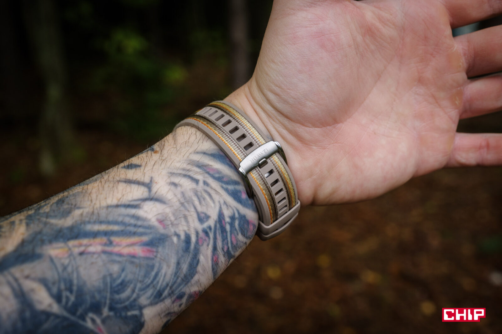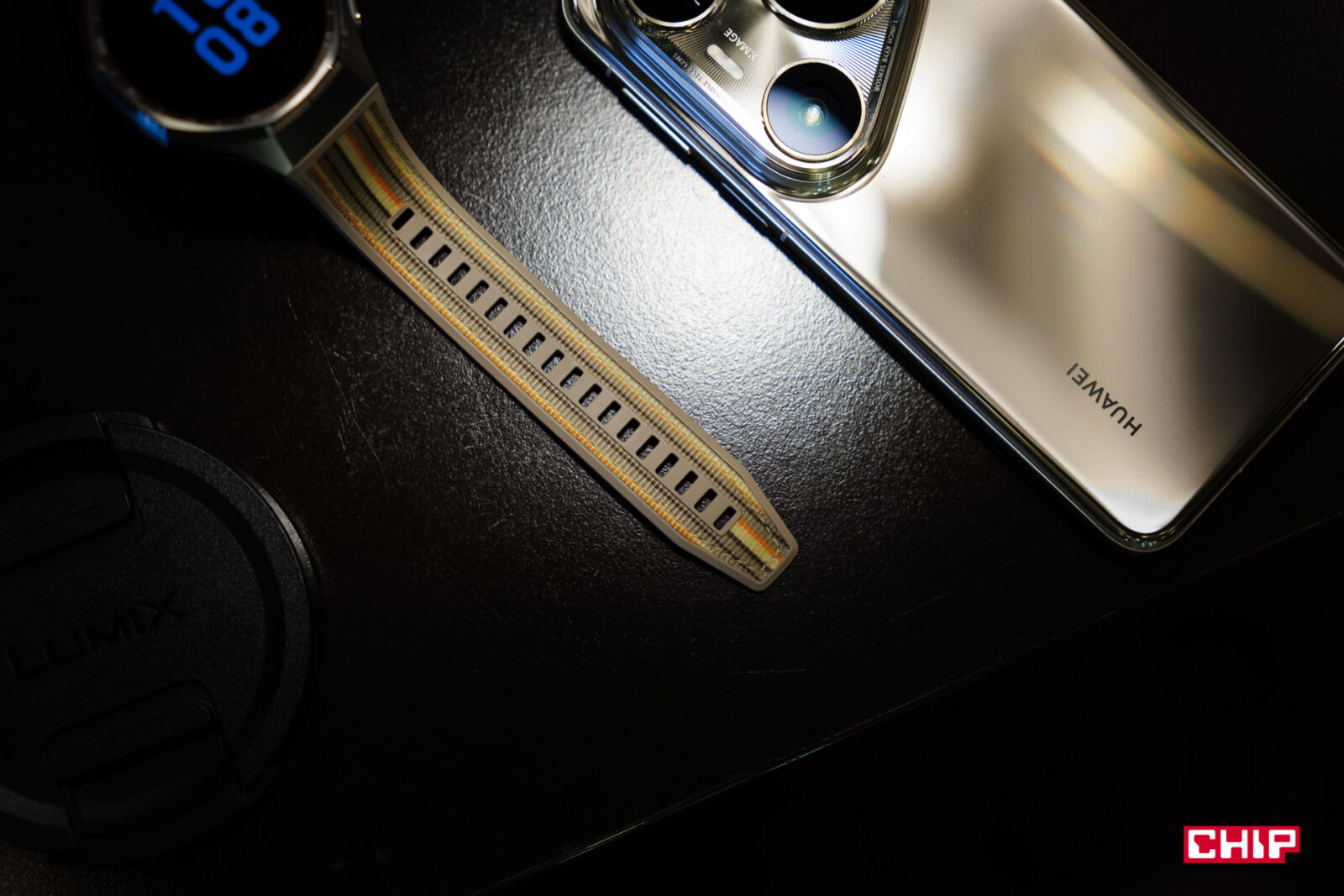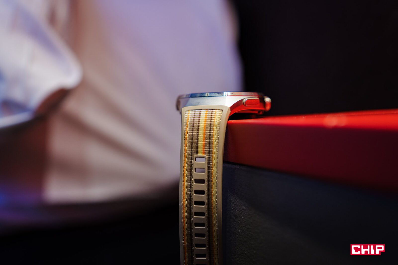 Z jednej strony zegarek jest mega elegancki, co jest zasługą beżowo-piaskowo-brązowych akcentów wokół ekranu. Największą robotę robi tu jednak pasek. Od spodu mamy fluoelastomer, czyli ogólnie rzecz biorąc guma, ale nie do końca. Bo w przeciwieństwie do gumy jest to materiał hipoalergiczny, więc jak ktoś ma różnego rodzaju alergie skórne to może to być idealne rozwiązanie. Z drugiej strony mamy materiał. Trudno powiedzieć, czy to jest jakiś nylon, elastyczne włókna… Huawei nazywa to tkaniną kompozytową i może przy tym zostańmy. Pasek jest bardzo miękki, elastyczny i idealnie dopasowuje się do ręki już po wyjęciu z pudełka. Nie musi się w żaden sposób dopasowywać, wygrzewać i tak dalej.