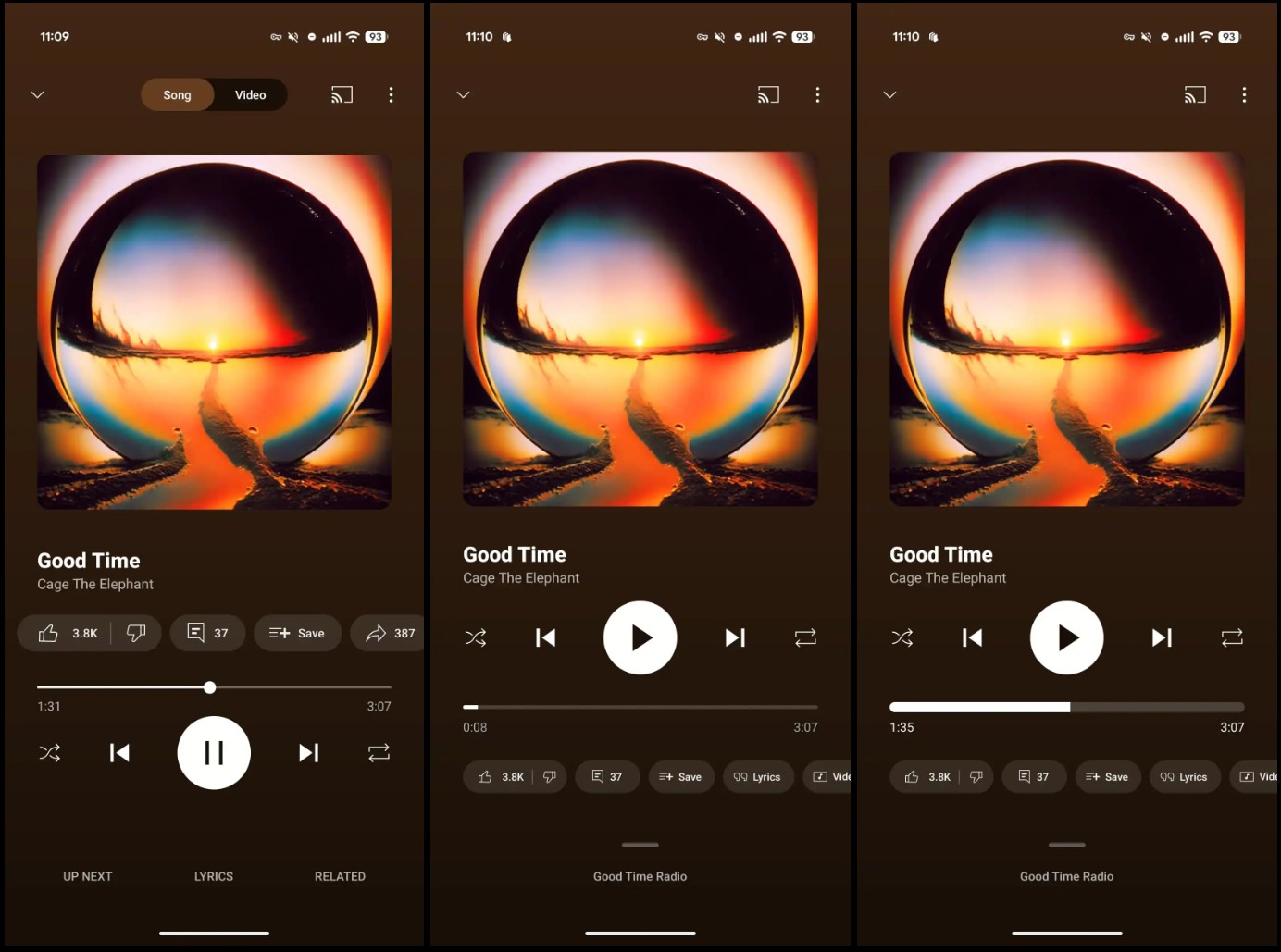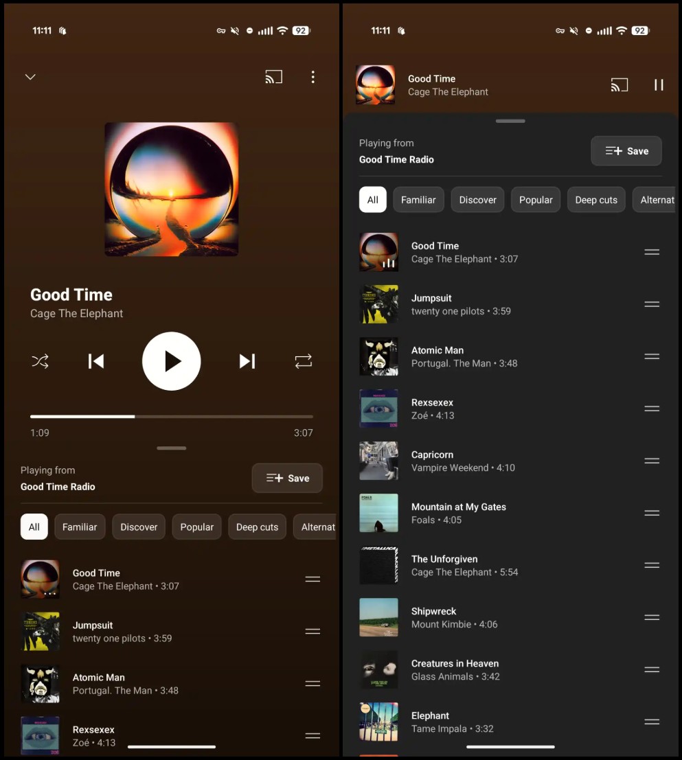 Głównym założeniem przeprojektowania było uproszczenie interfejsu i lepsze wykorzystanie ograniczonej przestrzeni ekranów smartfonów. Google postawił na kompaktowość i efektywność, co w teorii powinno przełożyć się na wygodę użytkowania. Pierwsza i najbardziej zauważalna zmiana to usunięcie przełącznika Utwór/Wideo z górnej części ekranu. Zamiast tego, ikony do przesyłania obrazu na inne urządzenia oraz menu z trzema kropkami pozostały na swoim miejscu. Pod nazwą utworu i nazwiskiem artysty, pojawił się rząd przycisków sterujących. Co prawda, wymaga to przesunięcia ręki nieco wyżej, ale jednocześnie daje więcej miejsca na dolne elementy.