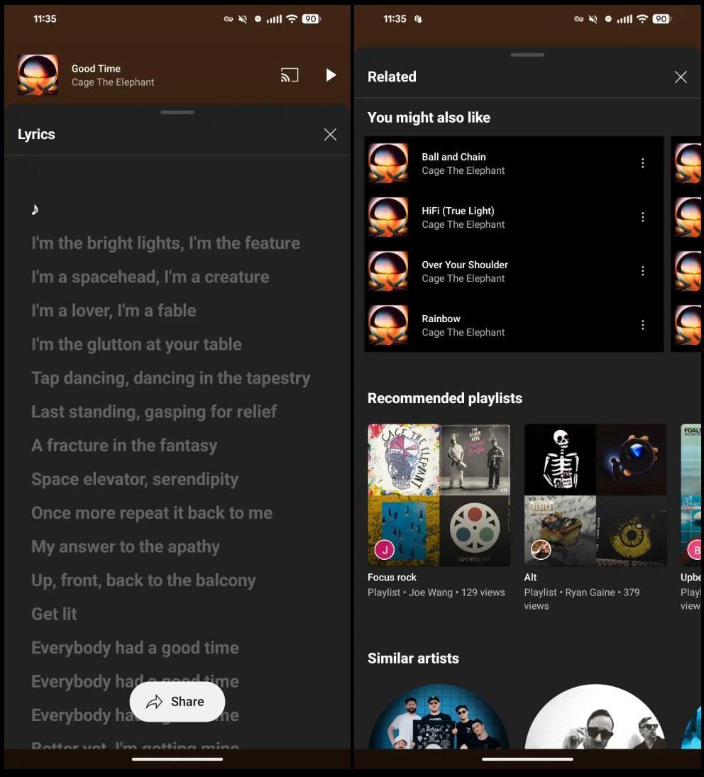 Testy nowego interfejsu rozpoczęły się już w listopadzie 2024 roku i teraz docierają do szerszego grona użytkowników. Arkusze Powiązane i Teksty można teraz w pełni rozwijać, rezygnując przy tym z dopasowania kolorystycznego do okładki albumu. W górnym rzędzie widzimy odtwarzany utwór z przyciskami play/pauza.