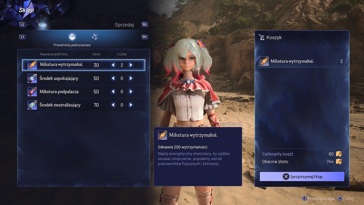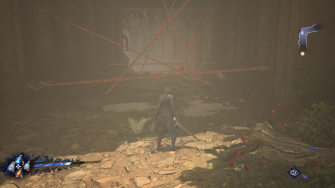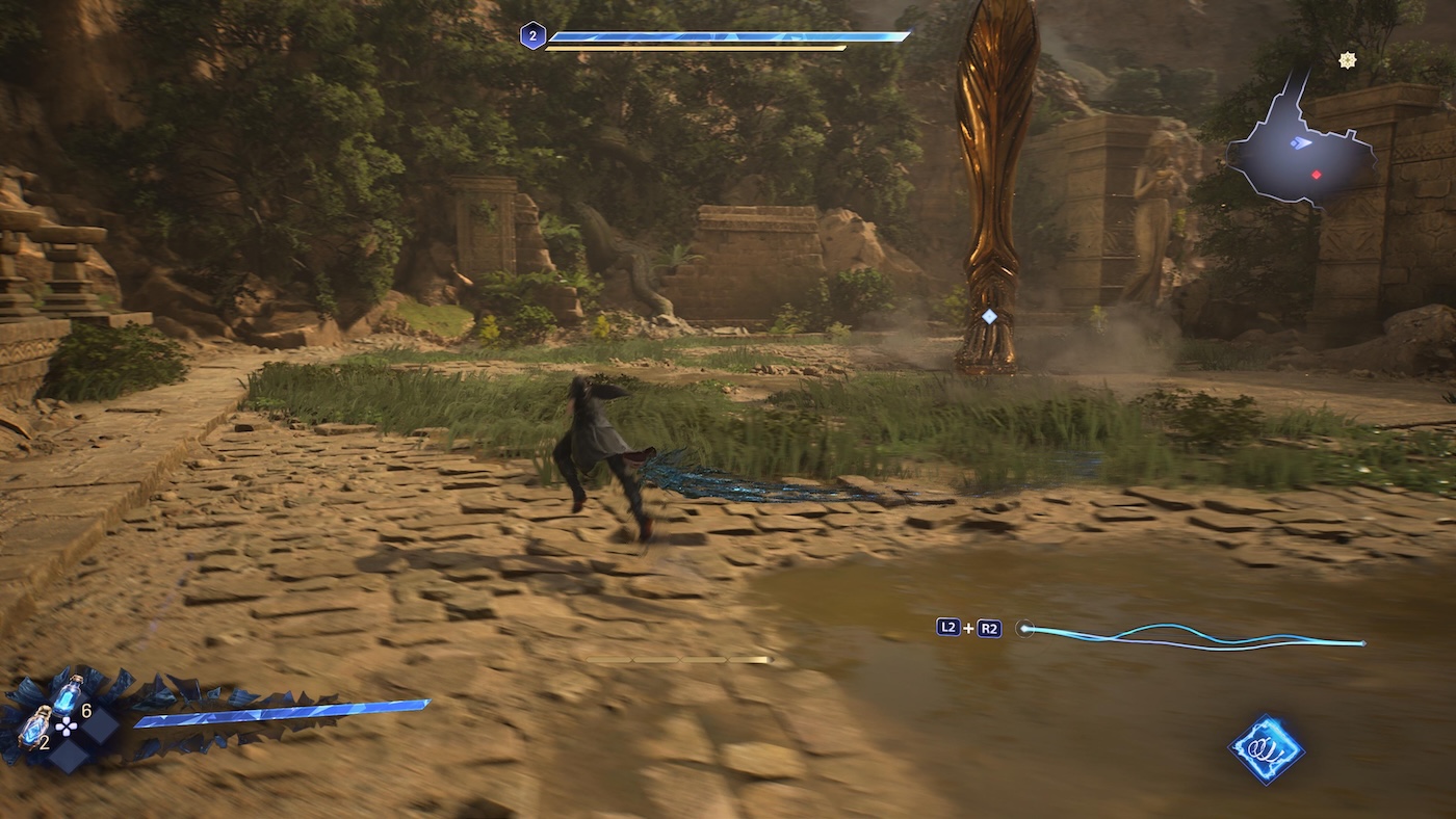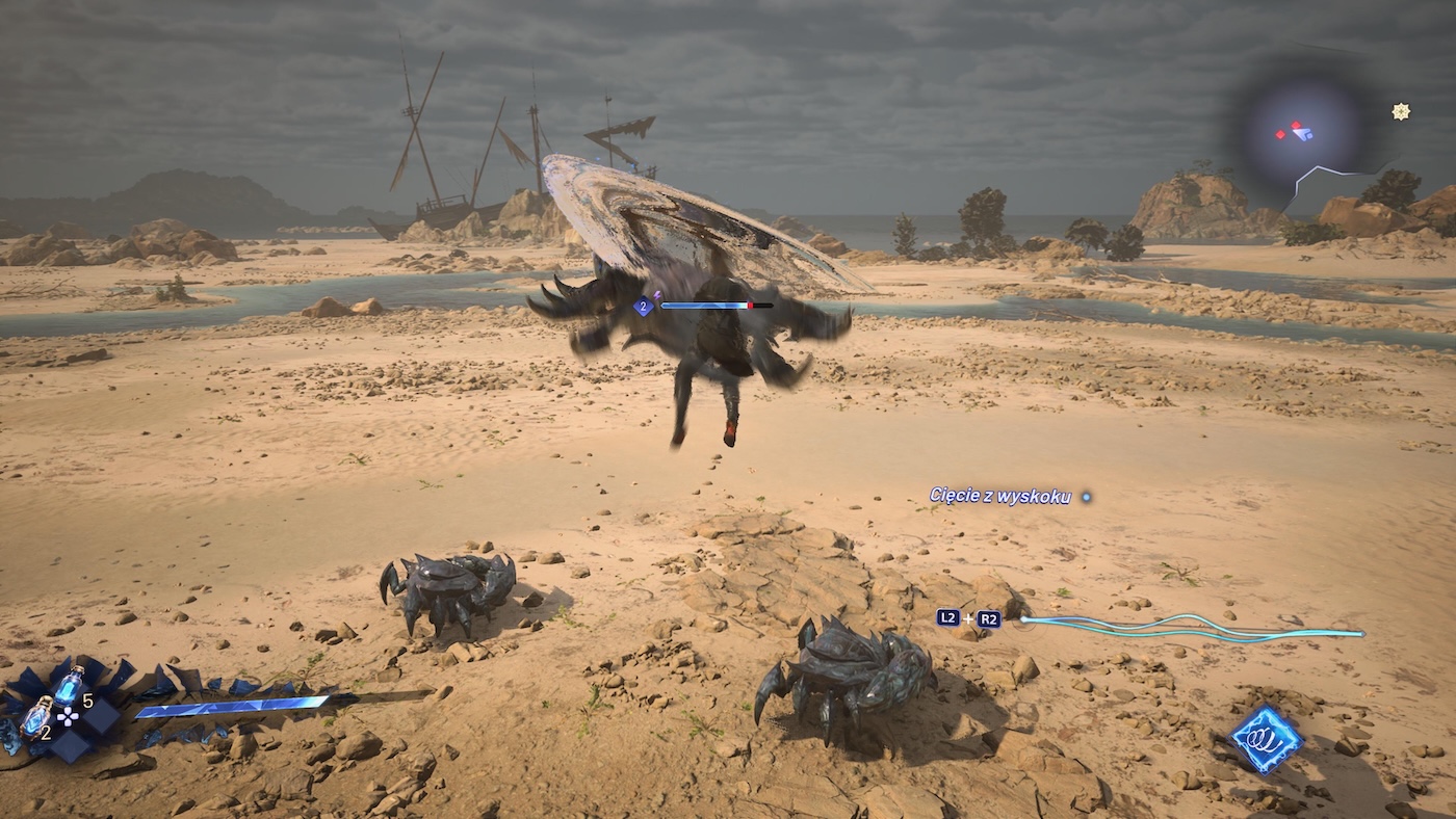 Nie tracimy przy tym zbyt wiele, muszę przyznać, bo eksploracja świata szczerze rozczarowuje. Zazwyczaj znajdujemy zwykłe przedmioty do podniesienia, najczęściej monety. Nie mamy żadnych realnych korzyści z lizania ścian, a też lokacje — mimo różnych klimatów i pozornie ładnych widoków — są do bólu nijakie. Czasem gra eksperymentuje z elementami platformowymi, ale ostatni raz tak złe skakanie widziałem chyba w Stellar Blade, z tym, że to była nieporównywalnie lepsza gra. Skakanie w większości zakończy się spadnięciem w przepaść przez pracę kamery czy trudne do wyczucia granice tekstur.