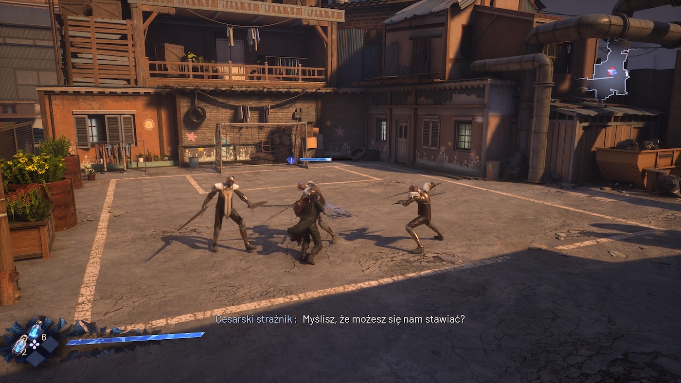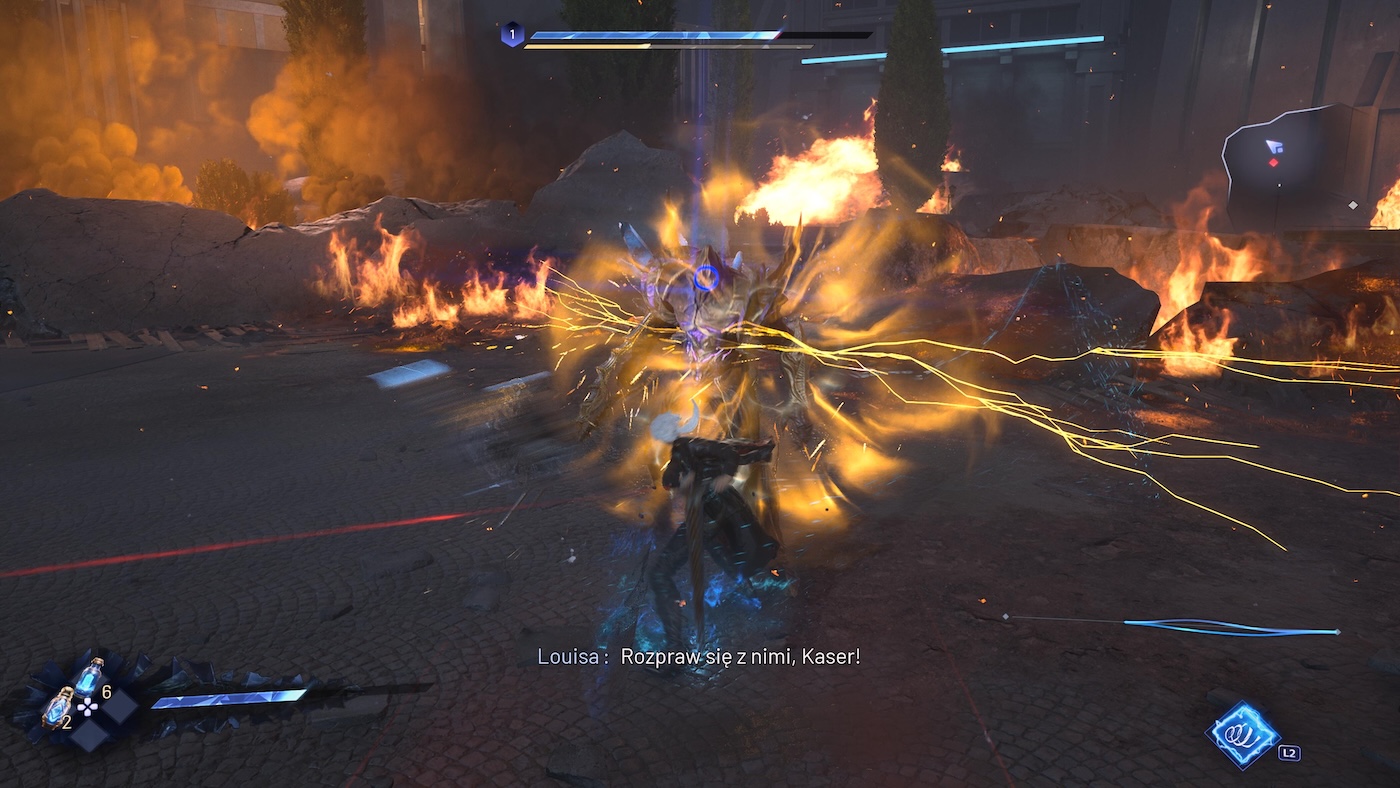 System walki opiera się przede wszystkim na timingu. Istotne tutaj są uniki, parowania i kontrataki, zwłaszcza w starciach z bossami — każdy z 10 głównych bossów ma unikalne fazy, wymagające zmiany strategii i uczenia się odpowiednich zachowań przeciwnika w każdej fazie. Gra nie ma wyboru poziomu trudności i chociaż nie jest to poziom souls-like’ów, to jest sensownym wyzwaniem. Nie rzucicie DualSensem o ścianę, ale jednocześnie nie jest to spacerek, który można przejść z zamkniętymi oczami.