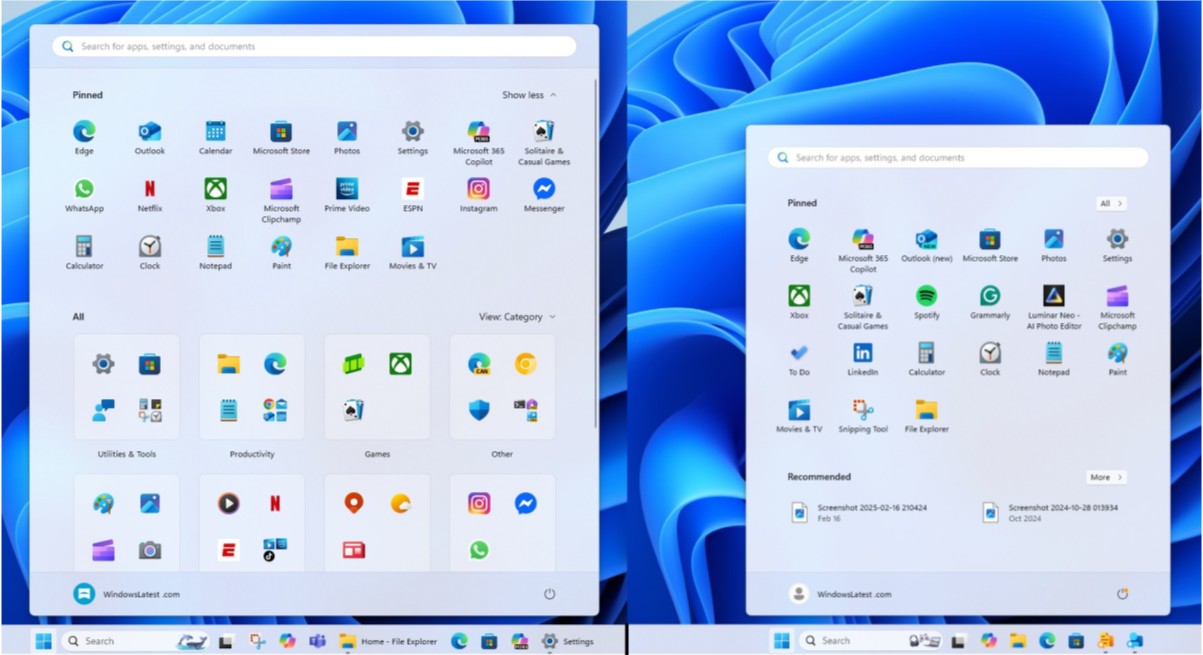 Najważniejszą zmianą jest połączenie obszarów Przypięte, Polecane i Wszystkie aplikacje w jeden ciągły widok. Nowy układ sprawia, że nawigacja staje się bardziej intuicyjna, choć wymaga nieco więcej przewijania. Interfejs został powiększony i lepiej wykorzystuje dostępną przestrzeń ekranu, co powinno docenić szczególnie użytkownicy większych monitorów.