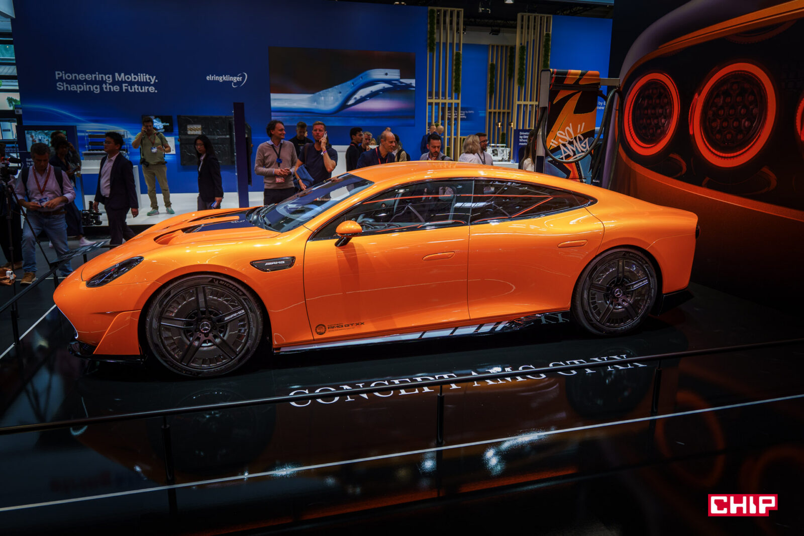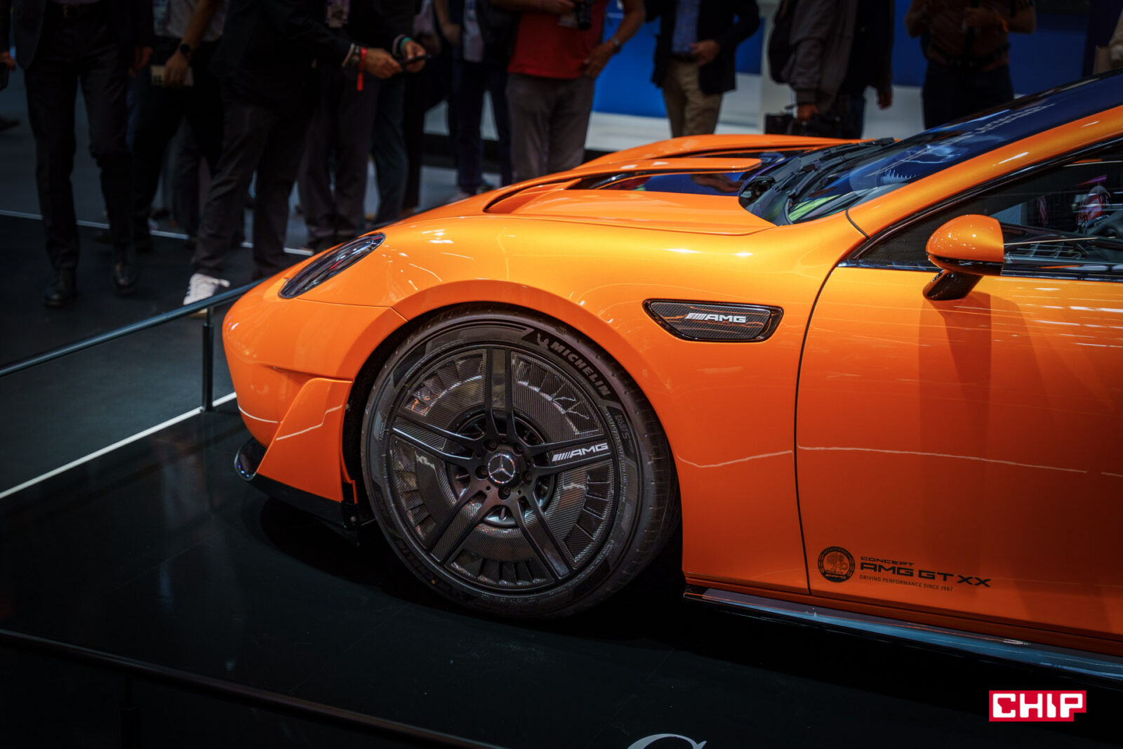 Naturalnie GLC nie był jedynym samochodem, którym Mercedes podbił tegoroczne targi IAA, bo pojawił się na nich również opisany niedawno przez nas AMG GT XX. Na poniższych zdjęciach autorstwa Arkadiusza Dziermańskiego możecie podejrzeć ten model stworzony specjalnie na tor, który jednak jednocześnie stanowi bazę technologiczną dla nadchodzącej architektury elektrycznej AMG.EA. Mercedes mówi nam, że auto, na które patrzymy, trafi do produkcji w niemal niezmienionej formie w 2026 roku i że to początek, a nie koniec nowego rytmu AMG. Marka szykuje też pierwszego SUV-a opracowanego w całości przez AMG na tej dedykowanej platformie – obok przyszłego spalinowego AMG w poszerzonej rodzinie GLC.