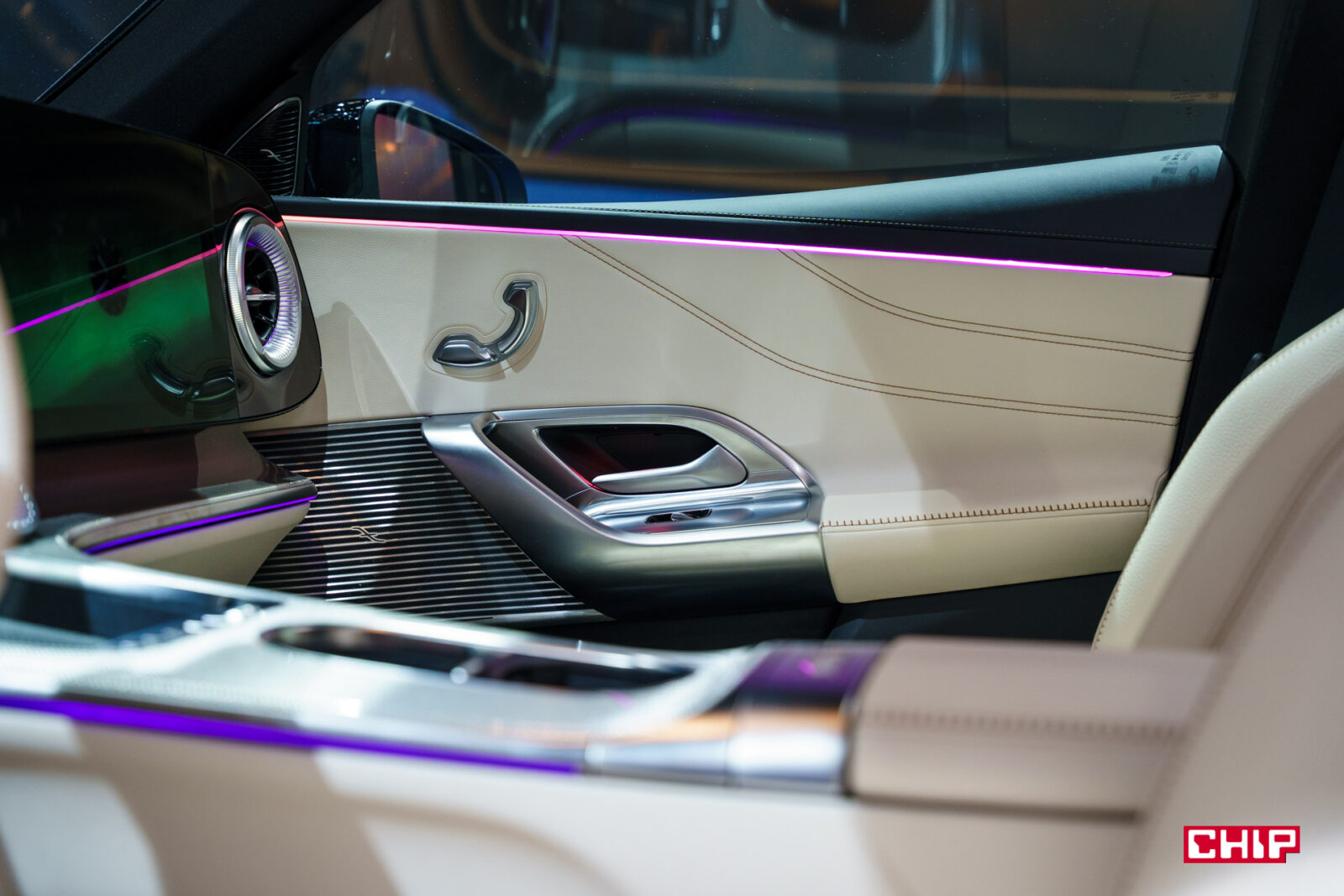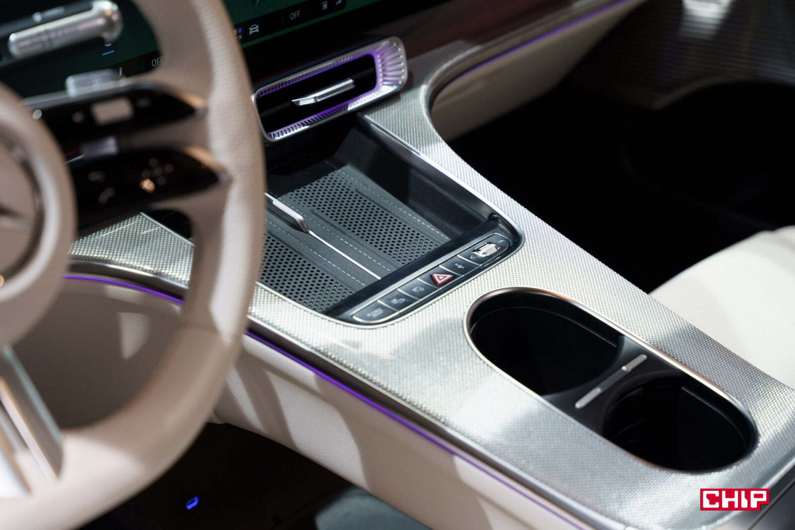 Co do ekranów: standard to MBUX Superscreen, a więc trzy osobne wyświetlacze pod jedną taflą szkła. Opcjonalny MBUX Hyperscreen o przekątnej 39,1 cala wizualnie przeciąga się przez cały kokpit. Wygląda jak jednolita szyba, ale dotykowe są tylko określone strefy kierowcy, centralna i pasażera. Otaczające szkło wypełniają animowane motywy i efekty ambientowe, co może na żywo wygląda świetnie, ale zżera dodatkową energię i nie oferuje niczego naprawdę funkcjonalnego. Kto jednak bogatemu zabroni? Zwłaszcza że w ofercie jest nawet certyfikowane, wegańskie wnętrze, co czyni Mercedesa pierwszym dużym producentem deklarującym niezależnie zweryfikowaną, w pełni wegańską kabinę.