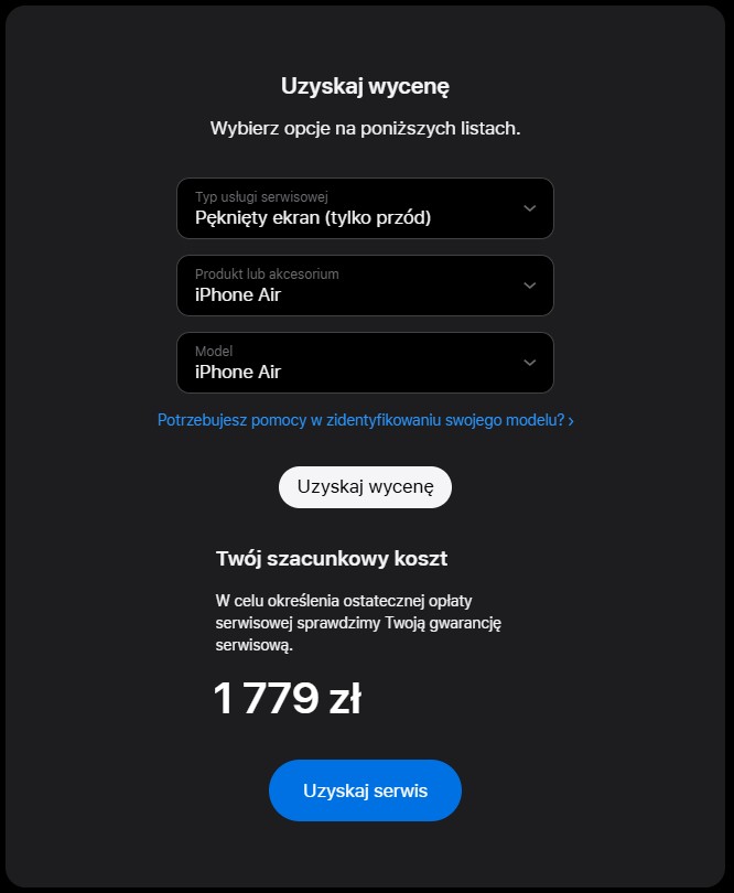 Przejdźmy teraz do aparatów. iPhone Air ze względu na smukłą konstrukcję ma z tyłu tylko pojedynczy aparat i jego naprawa ma kosztować 859 złotych. Taką samą cenę zapłacimy również przy modelu podstawowym. Modele Pro to już o wiele kosztowniejsza impreza – 1299 złotych. A co z “innymi uszkodzeniami”, które nie są objęte standardowym cennikiem? Tutaj ceny są już naprawdę wysokie: