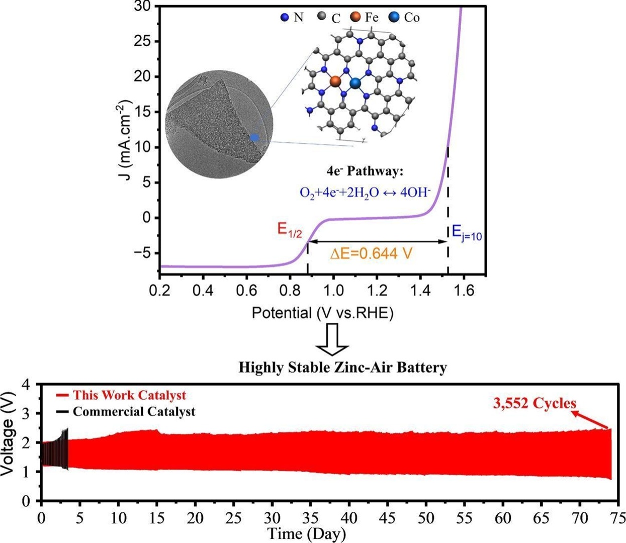 Teoretyczne zalety akumulatorów cynkowo-powietrznych są niepodważalne. Cynk jest łatwo dostępny na całym świecie, relatywnie tani i co najważniejsze, jest również nietoksyczny. Problem z nimi zawsze jednak leżał w reakcjach tlenu, które stanowiły prawdziwe wąskie gardło. Redukcja tlenu podczas rozładowania i ewolucja tlenu podczas ładowania wymagają wydajnego katalizatora, którego akurat dotąd brakowało. Naukowcy uderzyli właśnie w ten problem, opracowując nowy dwu-metaliczny katalizator jednoatomowy, w którym to atomy kobaltu i żelaza są osadzone w ultracienkich, porowatych arkuszach węgla.