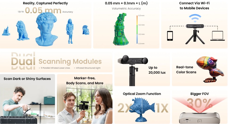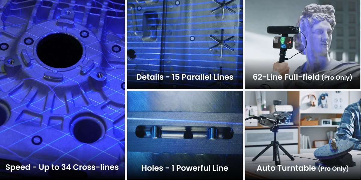 Dla profesjonalistów, którzy potrzebują najwyższej dokładności, Revopoint przygotował serię MetroY. Oba modele oferują imponującą precyzję do 0,01 mm, co stawia je wśród urządzeń klasy przemysłowej. Podstawowy MetroY oferuje trzy tryby skanowania: pojedynczej linii do głębokich otworów, linii krzyżowych z 15 parami niebieskich laserów przechwytujących 1,57 miliona punktów na sekundę, oraz równoległych linii laserowych. Ta elastyczność sprawia, że urządzenie radzi sobie z różnorodnymi kształtami i materiałami.