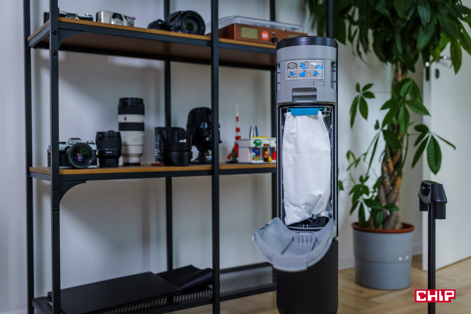 Utrapieniem osób posiadających odkurzacze pionowe jest konieczność od opróżniania. Jak dobrze wiemy, jak pojemniki na brud nie byłyby skonstruowane, zawsze coś wlezie za uszczelki i trudno jest to wyciągnąć. W przypadku stacji opróżniającej takiego problemu nie mamy. Odstawiamy do niej odkurzacz, a stacja automatycznie otwiera pojemnik i ze sporą mocą zasysa z niego wszystkie zabrudzenia. Oczywiście pojemnik możemy też otworzyć i opróżnić ręcznie. Co warto zauważyć, jeśli w pojemniku są śladowe ilości brudu, przykładowo w dniu pisania tego tekstu spadło mi kilka okruchów z talerza, to po ich odkurzeniu stacja nie opróżniała pojemnika.