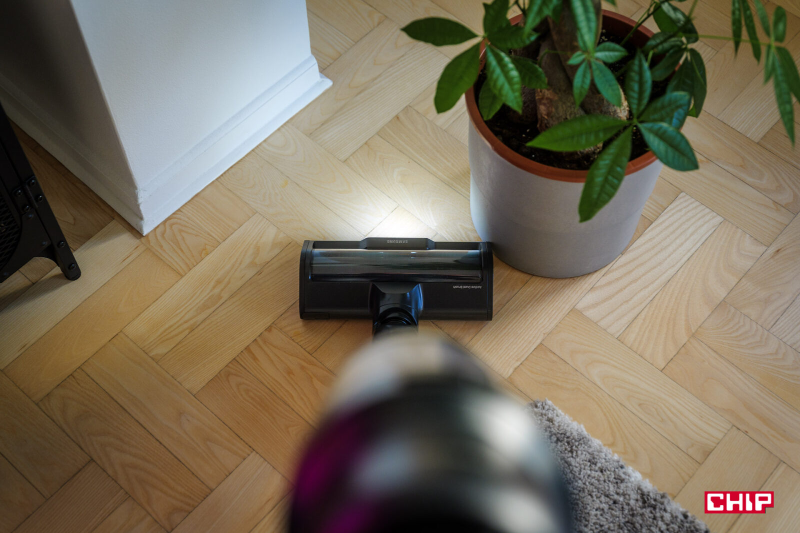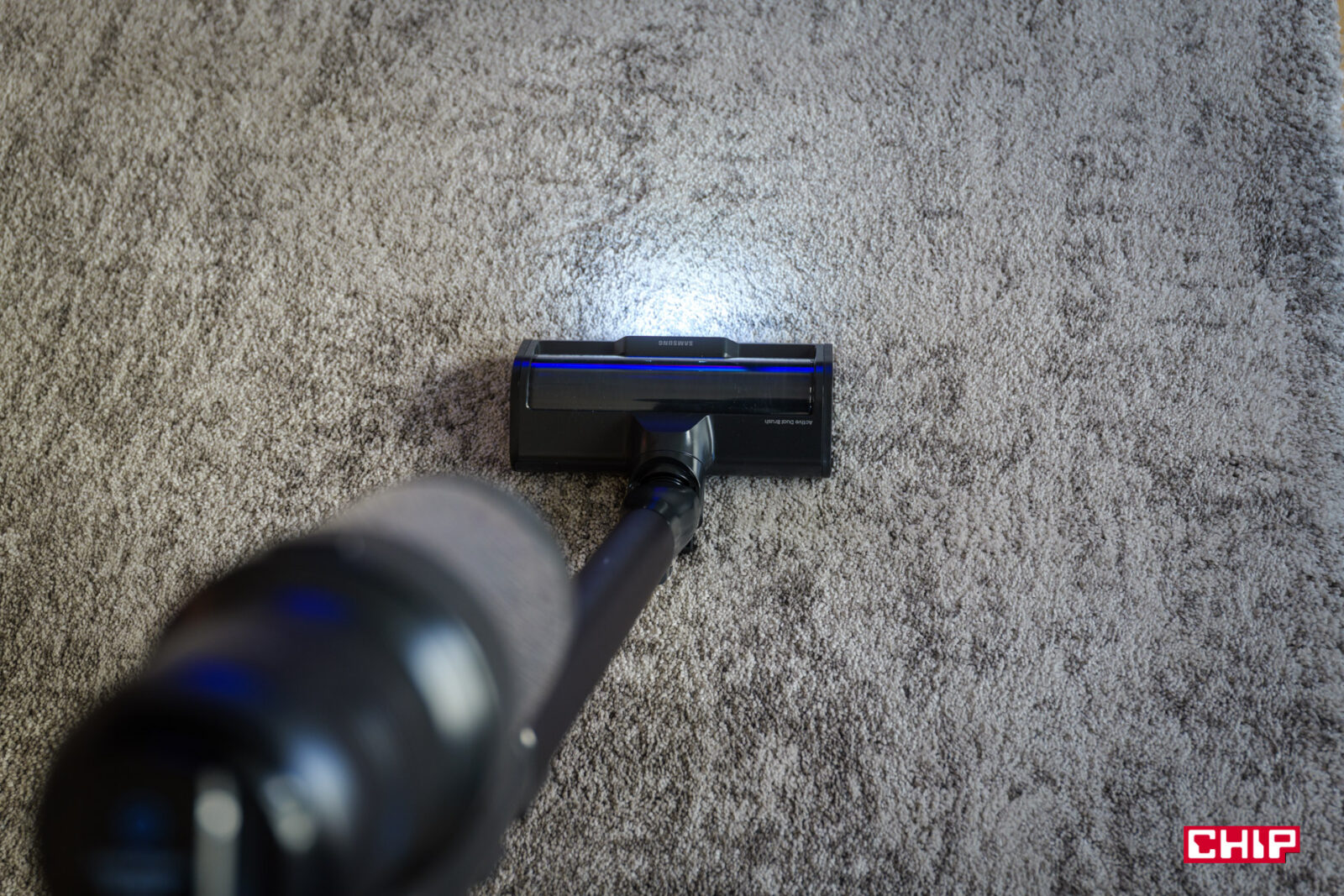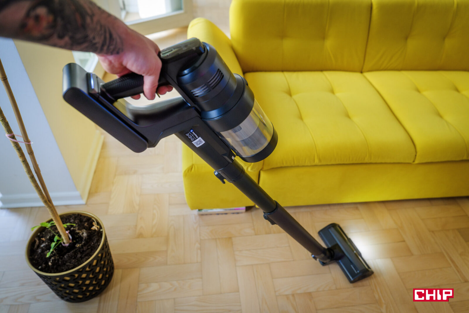 Bez zbędnego przedłużania, zabierzmy się za sprzątanie. Maksymalna moc odkurzacza to 400 W, co przekłada się na 33 000 Pa. Jest to jeden z topowych wyników wśród odkurzaczy pionowych i mówimy tu oczywiście o najmocniejszym trybie pracy, zwanym Jet Mode. Samsung chwali się przy tym, że jego odkurzacz nie tylko sprząta, ale też oczyszcza powietrze. To zasługa 12 cyklonów i 33 wlotów powietrza, które zasysają z otoczenia najdrobniejsze cząsteczki kurzu. To tyle, jeśli chodzi o marketing…