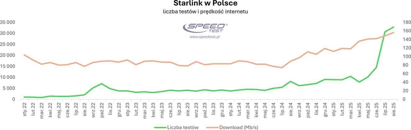 Co istotne, obniżka cen to nie jedyna dobra wiadomość dla obecnych i potencjalnych użytkowników. W ciągu ostatnich czternastu miesięcy zaobserwowano dwukrotny wzrost prędkości pobierania danych – z 74 Mb/s w lipcu 2024 roku do 156 Mb/s w sierpniu 2025. Również inne parametry uległy wyraźnej poprawie – ping spadł prawie dwukrotnie z 60 do 32 milisekund, a prędkość wysyłania osiąga obecnie blisko 25 Mb/s. Taka poprawa wydajności najprawdopodobniej wynika z dodania sporej liczby satelitów do konstelacji oraz rozbudowy infrastruktury naziemnej.
