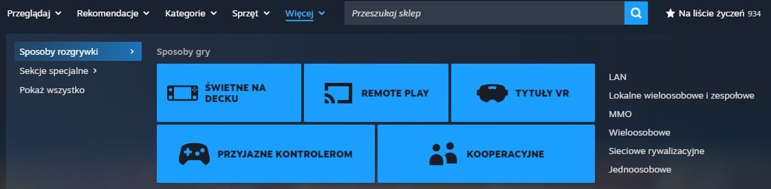 Interesującym dodatkiem jest sekcja „Sposoby rozgrywki”, która odpowiada na rosnące zróżnicowanie platform w ekosystemie Valve. Ta zakładka oferuje szybki dostęp do gier zoptymalizowanych pod Steam Deck, tytułów przyjaznych kontrolerom oraz produkcji VR. Dla użytkowników poszukujących gier kompatybilnych z konkretnym sprzętem to spore ułatwienie, ponieważ zamiast mozolnego filtrowania długich list, wystarczy jedno kliknięcie, by zobaczyć dopasowane propozycje.